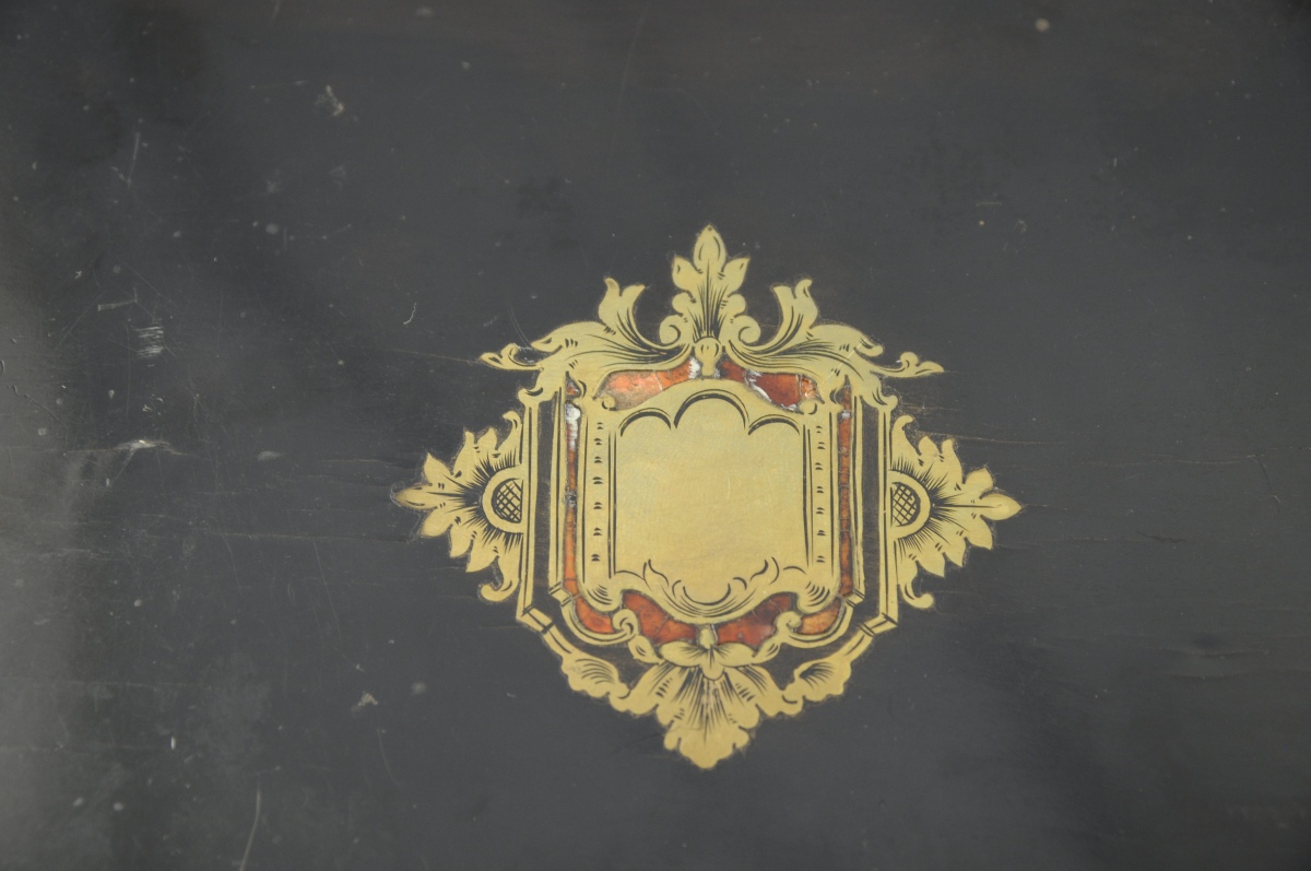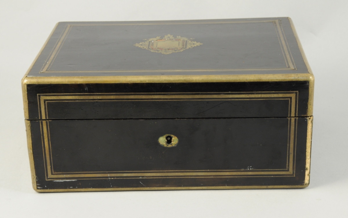 COFFRET rectangulaire en placage de bois noirci, filets de laiton et marqueté d'un cartouche polylobé flanqué de feuilles d'acanthe et palmettes stylisées en laiton et matériau à l'imitation de l'écaille. Deux poignées latérales en laiton ciselé. Napoléon III. Haut. 13,2, Larg. 30,6, Prof. 22,5 cm.