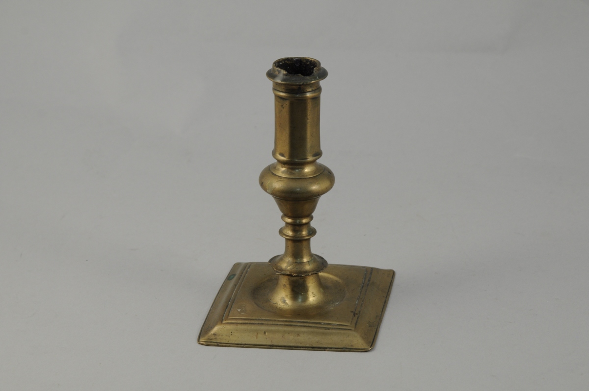 BOUGEOIR en bronze reposant sur une large bas carrée. Fût cerclé de bagues supportant un haut binet à pans coupés. Tavail ancien. Haut. 17, Larg. 11,9 cm.