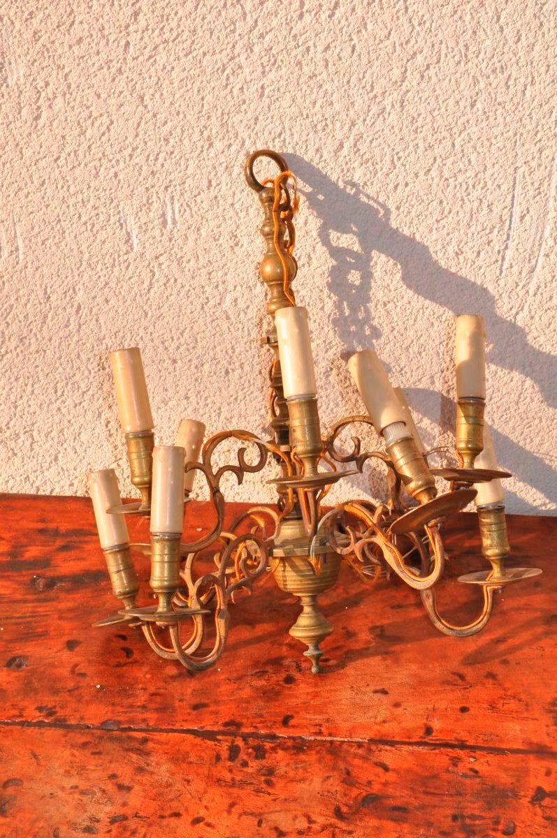 LUSTRE à clavettes en laiton à neuf bras de lumière de forme mouvementée sur deux registres: six sur le registre inférieur et trois sur le supérieur. Fût central tourné en balustre et terminé par une toupie. Travail dans le style hollandais du XVIIème. Haut. 48, Diam. 41 cm. (binets et bobèches percés pour l'élecité, manques et usures)
