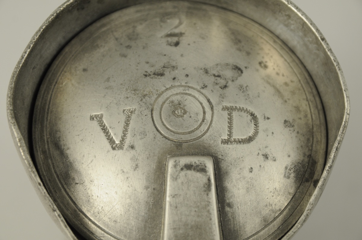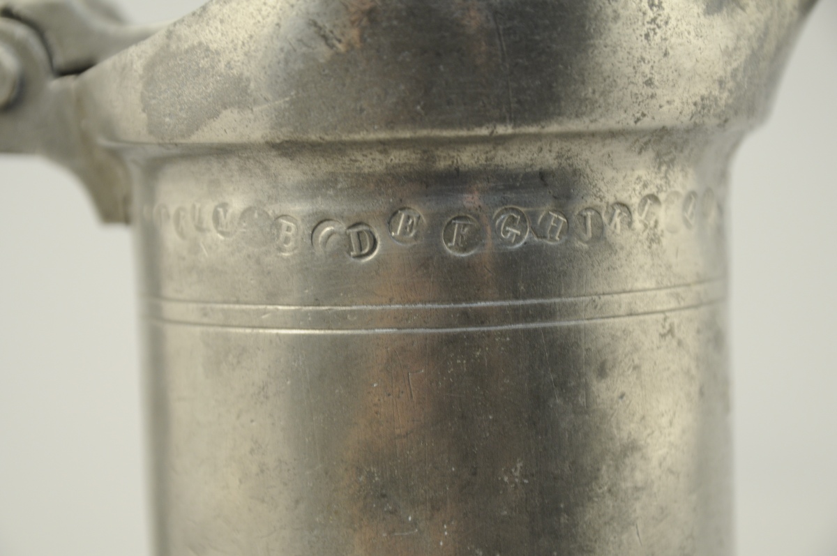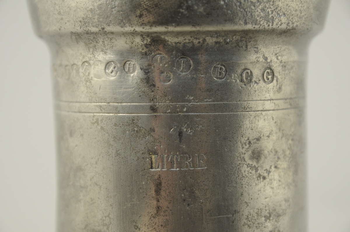 PICHET-MESURE en étain, pour un litre. Par Vrizet. Couvercle à poussoir, marqué des initiales "VD". Nombreux poinçons. XIXème. Haut. 22,5 cm. (enfoncements)
