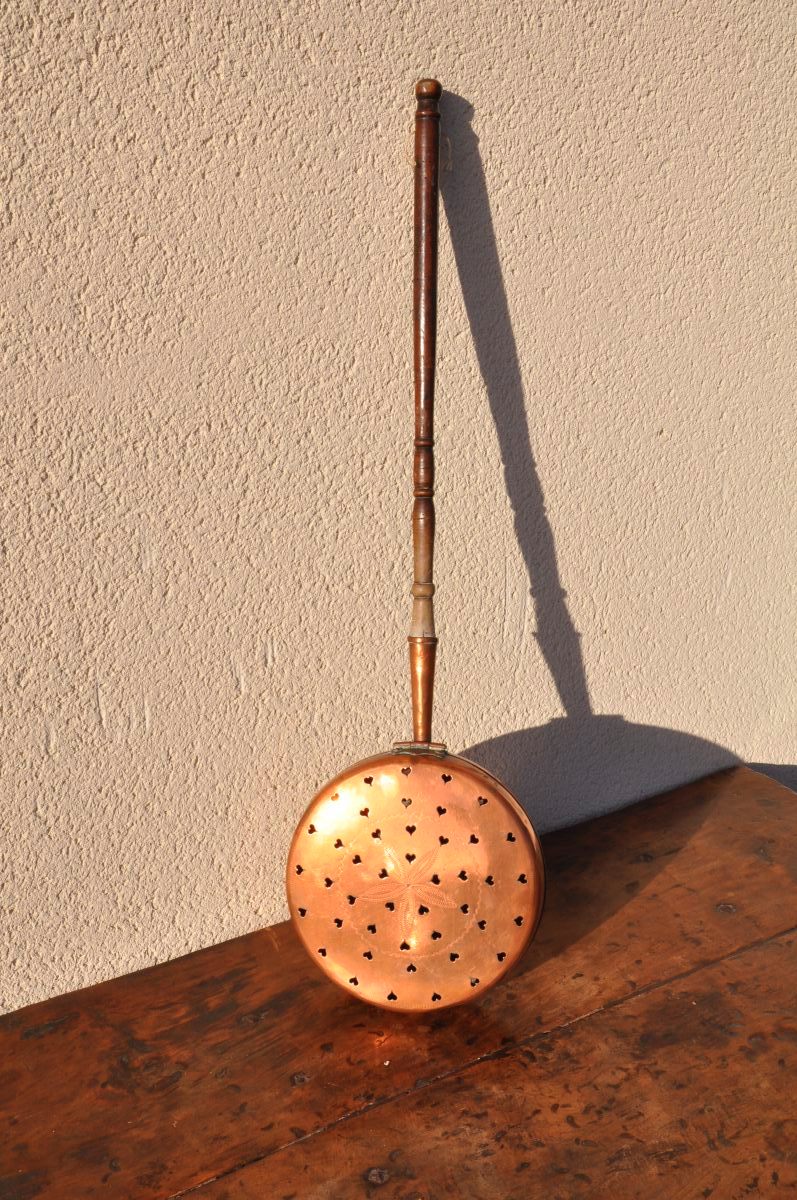 BASSINOIRE en cuivre. Couvercle à décor ajouré de petits curs et ciselé d'une rosace. Manche en bois naturel tourné.