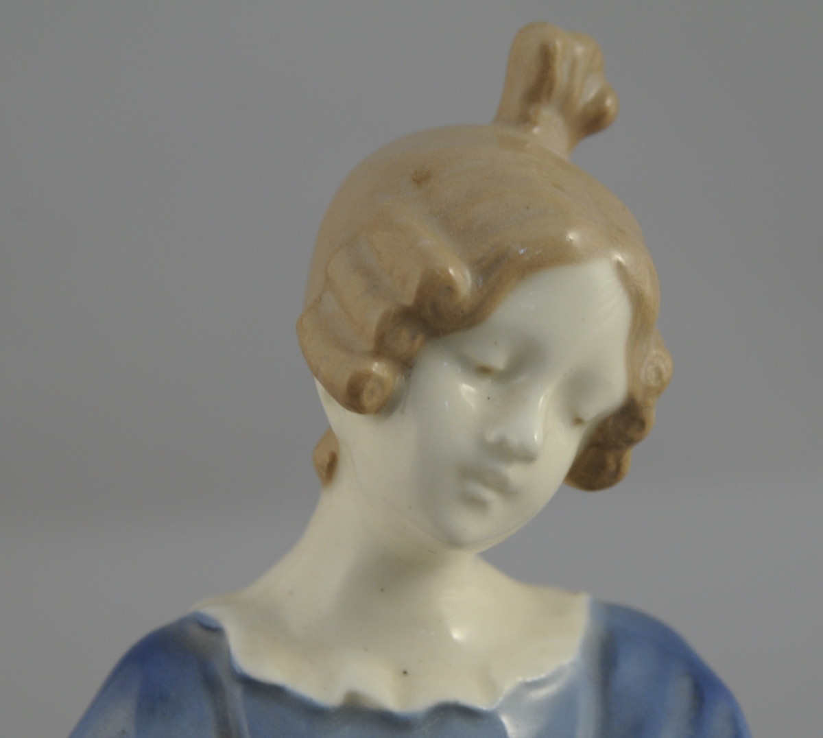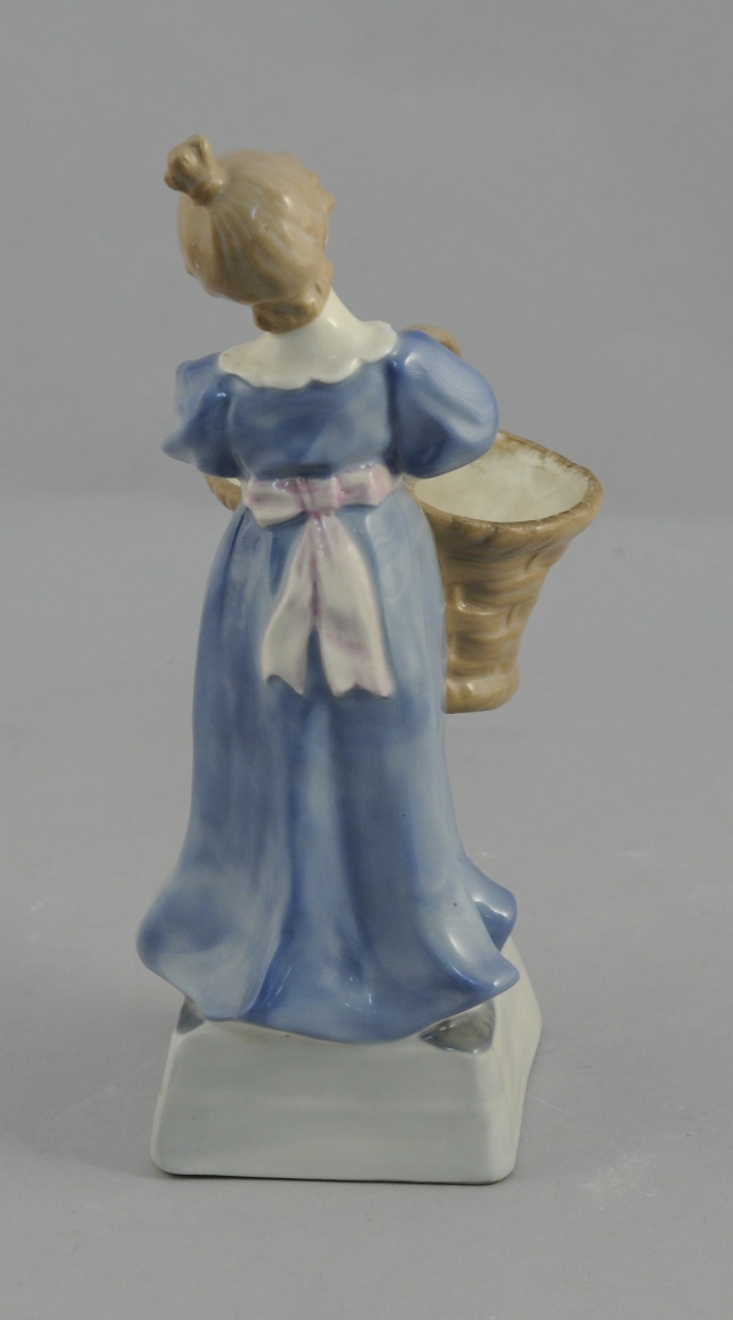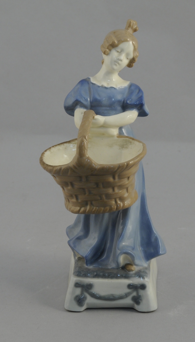SUJET en faïence polychrome représentant une jeune femme portant une corbeille de fleurs.