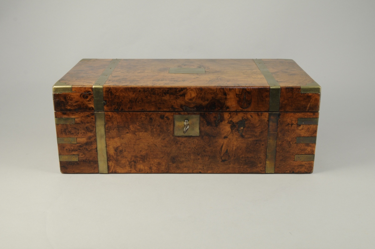 ÉCRITOIRE en placage de ronce de noyer et garnitures de laiton. Elle découvre un intérieur garni de velours jaune, avec des compartiments à encre et plumes.