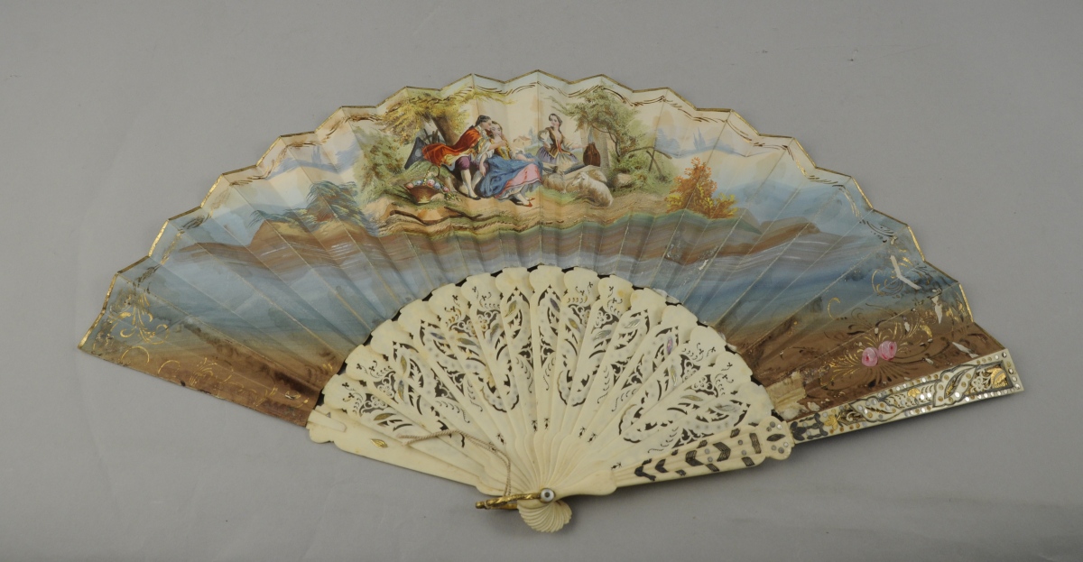 EVENTAIL PLIE à feuille de papier imprimée au recto de scènes troubadour courtoises réhaussées à la gouache et gauffrées à l'or, et peinte au verso à l'aquarelle d'un paysage lacustre et de deux bouquets de roses. Quatorze brins en ivoire à motifs ajouré fleuris et réhaussés de métal doré et argenté. Circa 1840. Hauteur: 27 cm. (un brin restauré).
