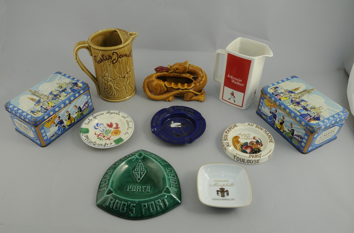 - Cinq cendriers de la marque "CHAMPAGNE MONTEBELLO", "COGNAC MONET", "ROB'S PORT", "LE PRINTEMPS" et "AU BON MARCHE / PARIS".