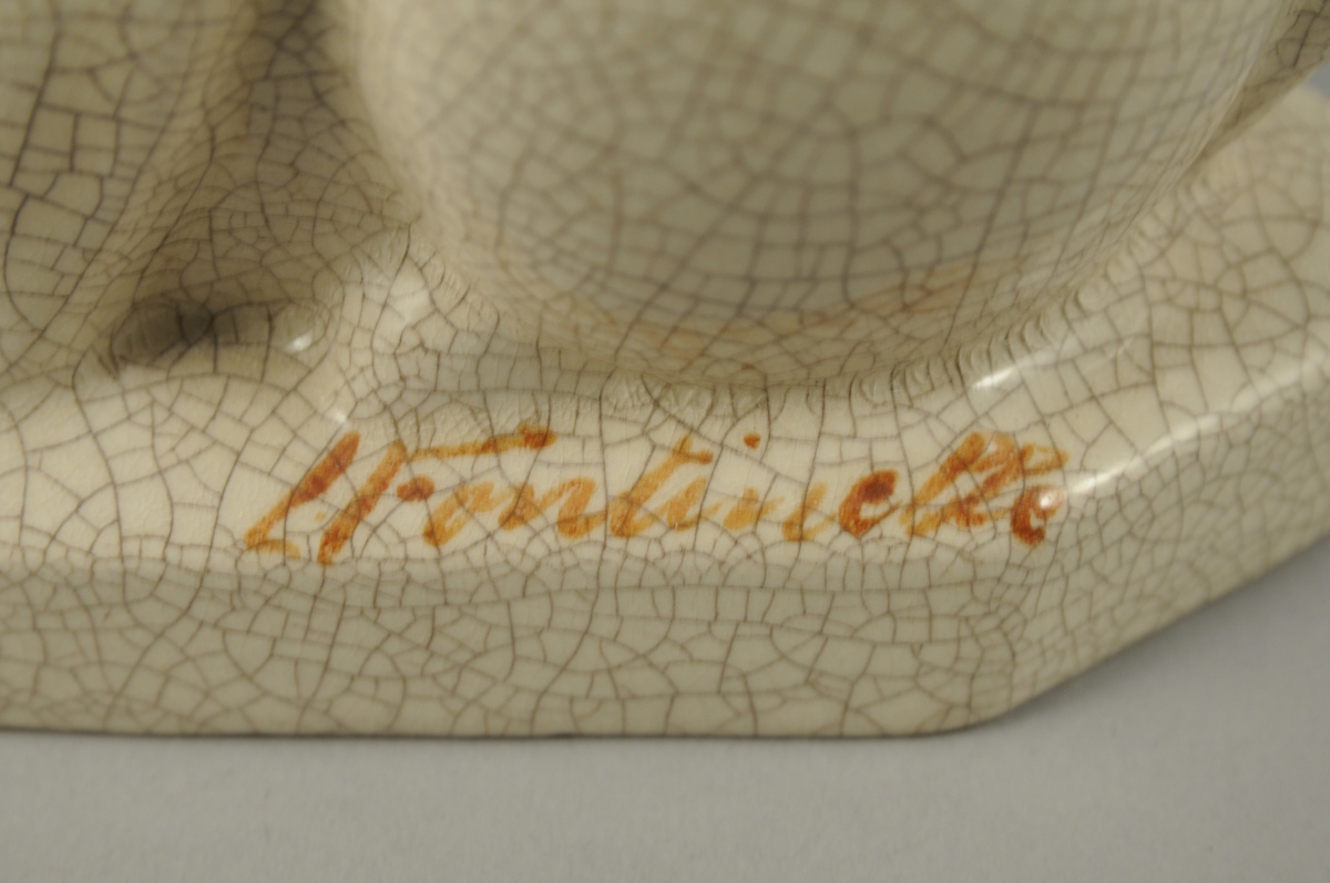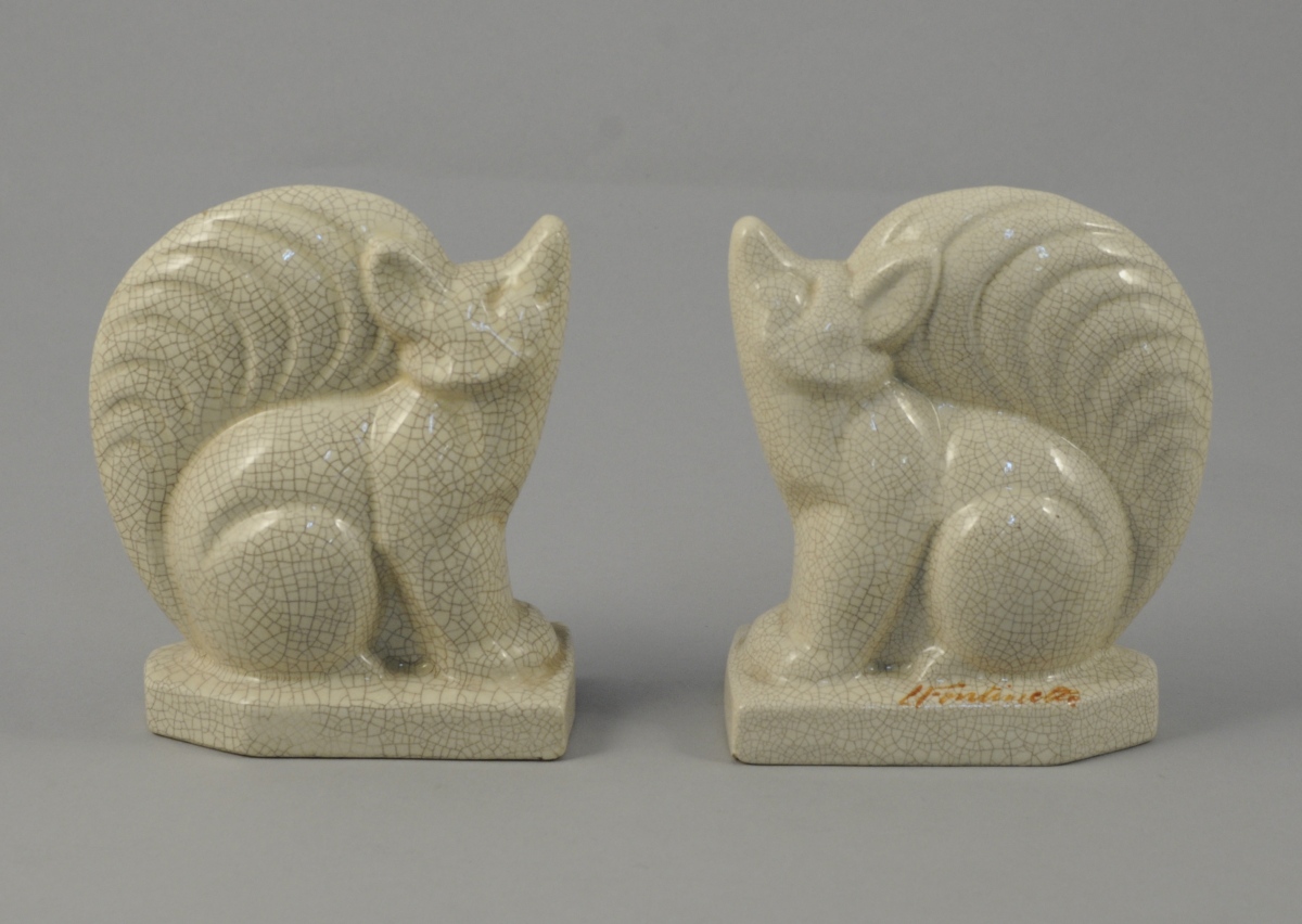 PAIRE DE SERRE-LIVRES représentant des renards en faïence craquelée crème. Marqués "L. FONTINELLE / FRANCE / 191" pour Louis FONTINELLE (1927-1964). style Art Déco. Haut. 15 cm. (légers éclats)