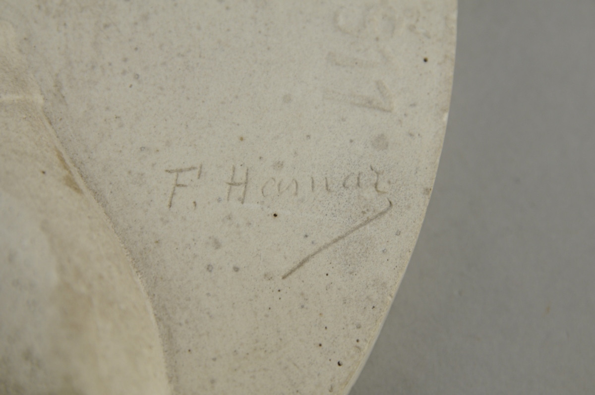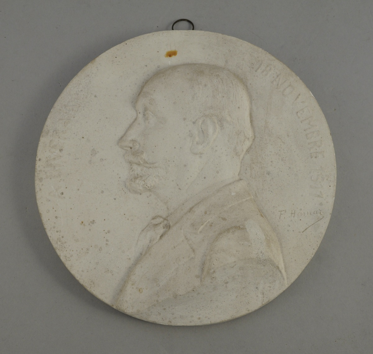 GRAND MEDAILLON en plâtre représentant un homme barbu de profil. Marqué "A. RIVERAIN / 18 NOVEMBRE 1911" et signé "F. HAMAR". Diam. 23 cm.