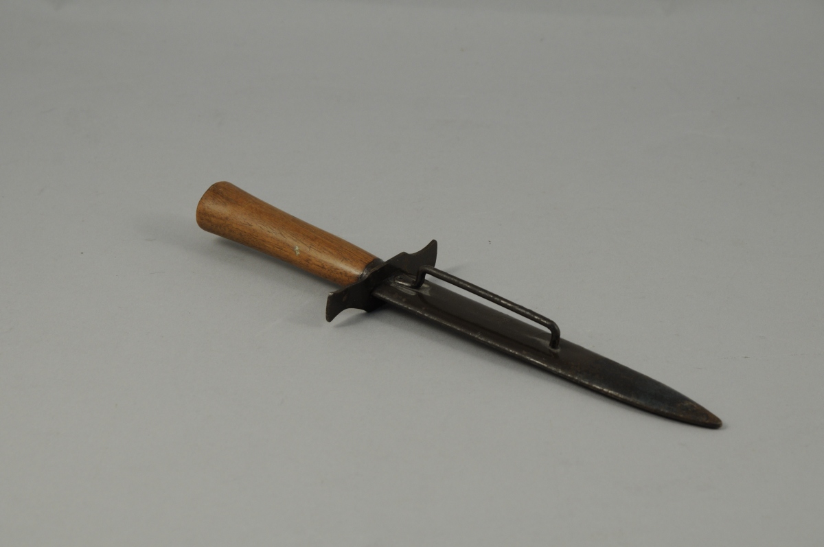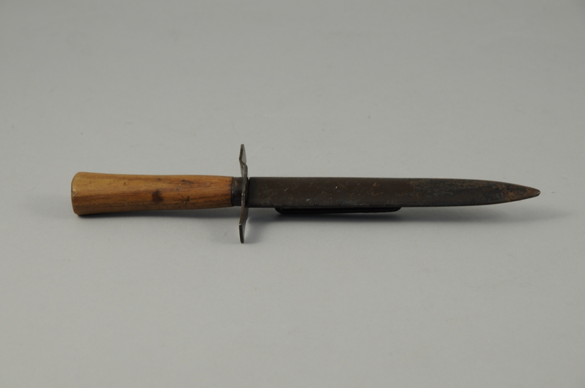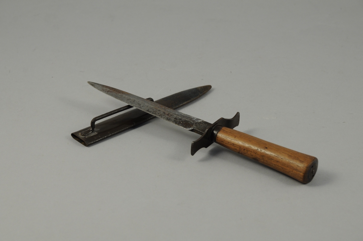 BOURGADE, poignard dit "Le Vengeur de 1870", modèle 1916, fourreau, garde et virole en métal laqué brun, poignée en bois; lame à double tranchant. Marque "BOURGADE" aux côté de la "Tête de Chinois" et garde poiçonnée "B". Ce poignard de tranchée équipa les fantassins de la Grande Guerre mais également les Tankistes Français de 1917 à 1940.