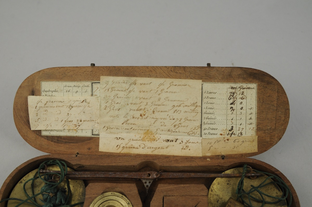 BALANCE DE CHANGEUR, et ses masses, en acier poli avec fléau à bras égaux dont le point d'appui est constitué d'un couteau central. Aux extrémités du fléau sont suspendus deux petits plateaux en laiton destinés à peser les pièces de monnaie. Le tout dans un coffret de forme oblongue en noyer.