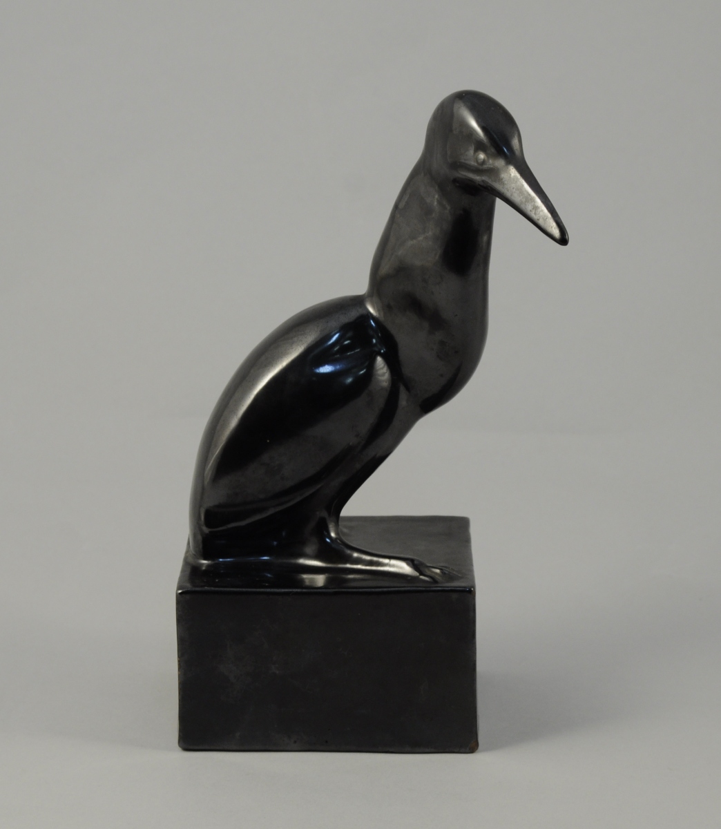 STATUETTE en céramique sous couverte gris anthracite métallisé représentant un héron (Butor étoilé) reposant sur un haut socle quadrangulaire . Signé sous couverte: Robert HAINARD (né en 1906) et Paul-Ami BONIFAS (né en 1903) sur la base. Circa 1930. Haut. de l'ensemble 30,3 cm. (légères égrenures sur la base)