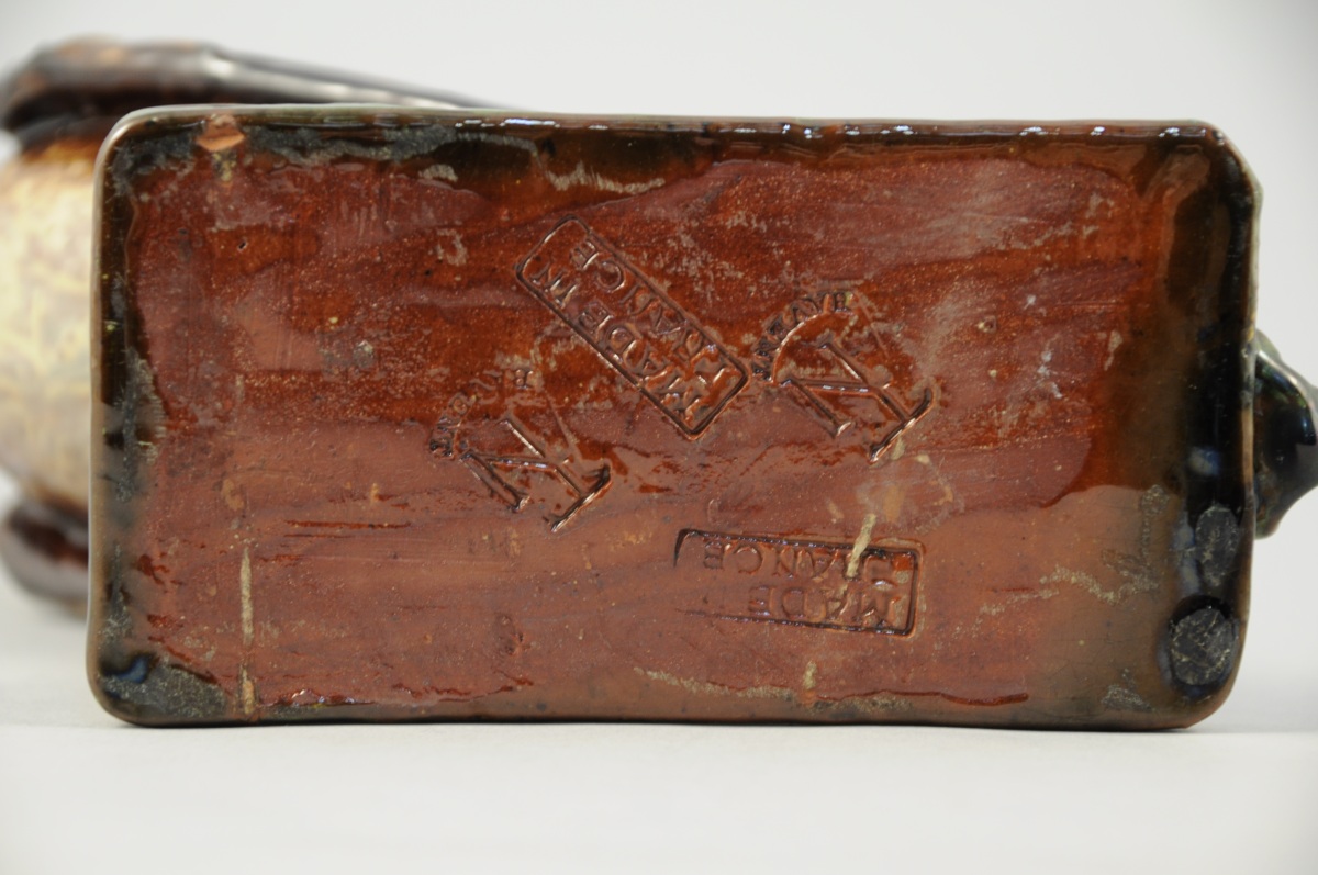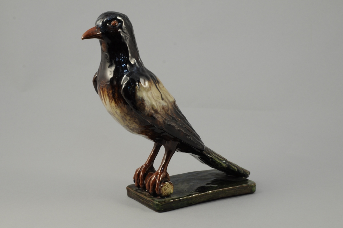 STATUETTE en faïence émaillée représentant un corbeau sur une base rectangulaire. Décor polychrome au naturel. Marques en creux de la manufacture de Bavent (Calvados). Haut. 29 cm.