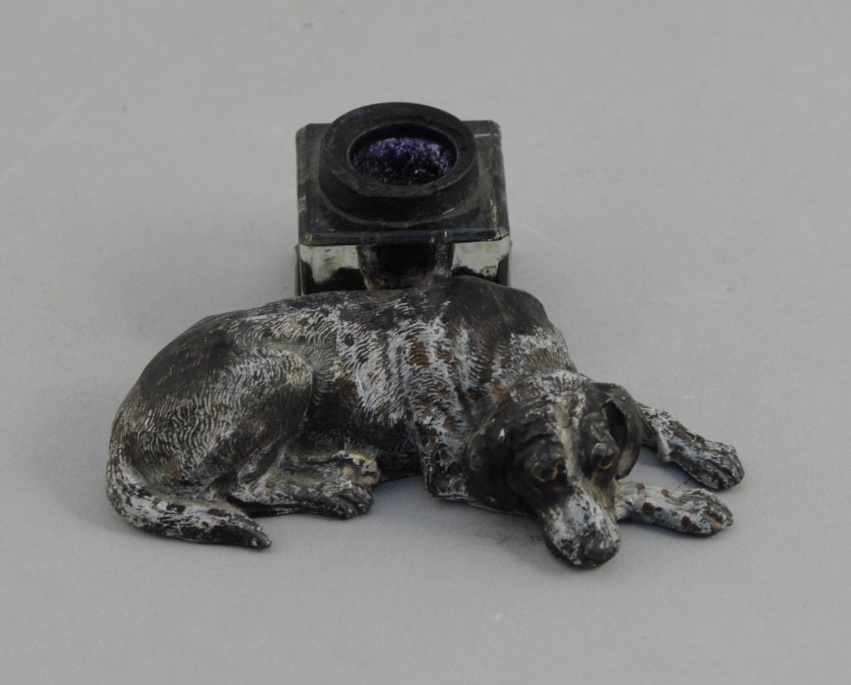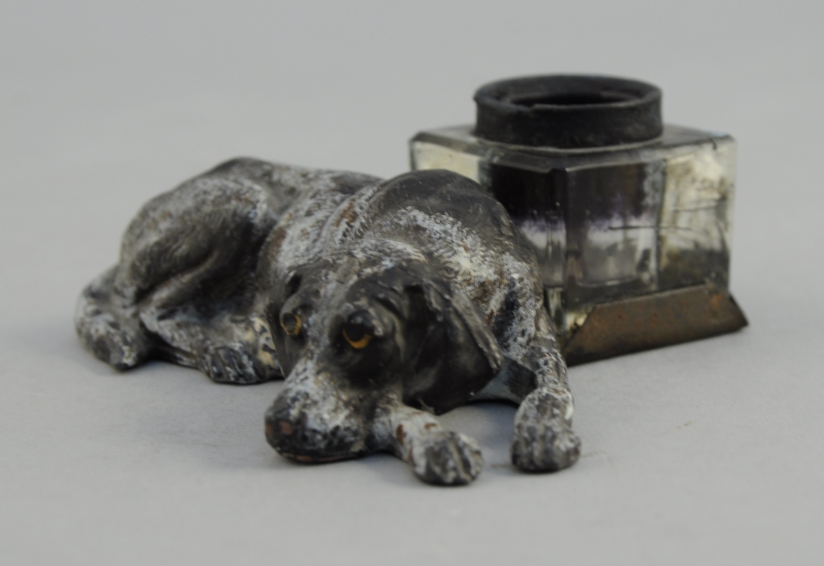 ENCRIER, en forme de chien couché en étain peint blanc, brun et orange pour les yeux. Godet carré en verre. Long. 11 cm