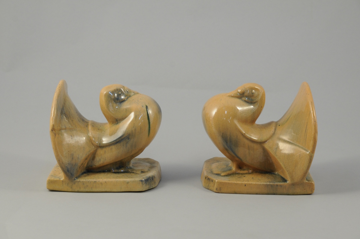 SERRE-LIVRES en faïence émaillée beige orangée représentant deux pigeons se rengorgeant. Style Art Déco. Circa 1930. Haut. 14,8, Long. 17, Larg. 12,2 cm.