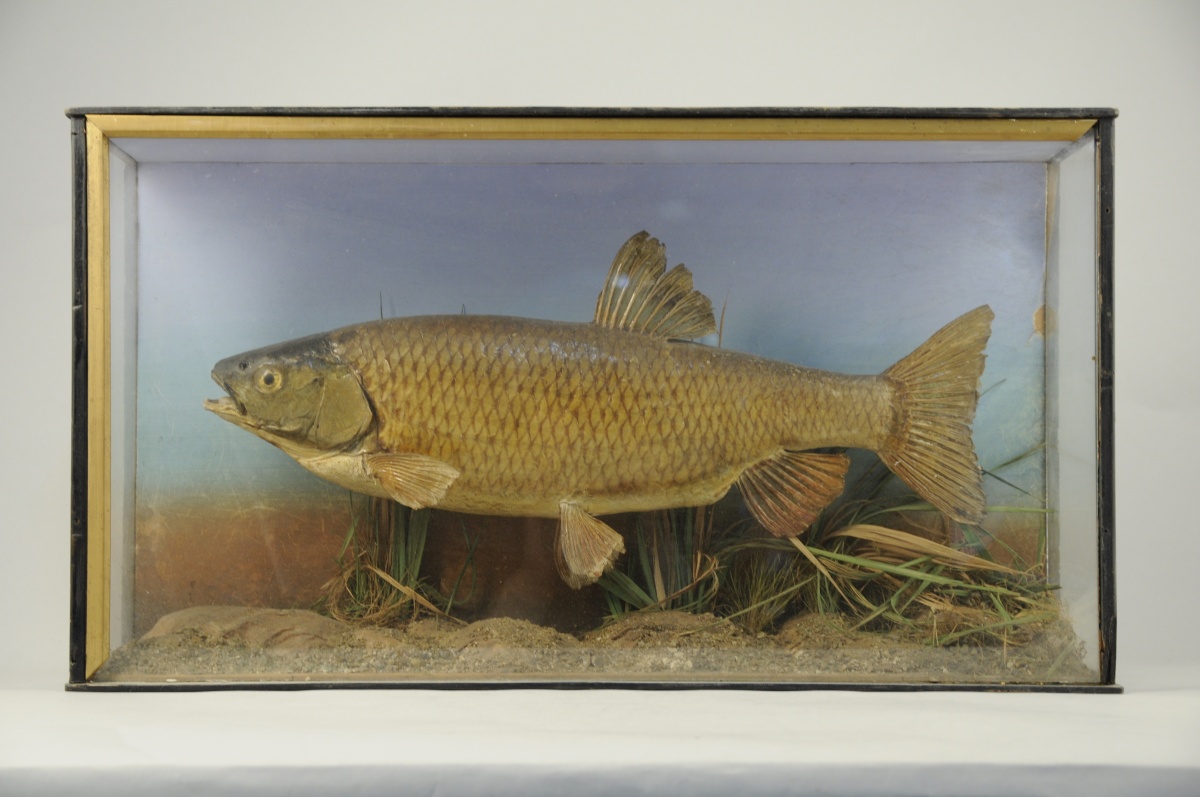 TROPHÉE DE PÊCHE. Carpe Ctenopharyngodon, dit amour blanc, présentée en diorama dans un fond de rivière naturalisé. Dans une vitrine (accidentée). Première moitié du XXème. Long. 63, Haut. 35,1, Prof. 16,2 cm.