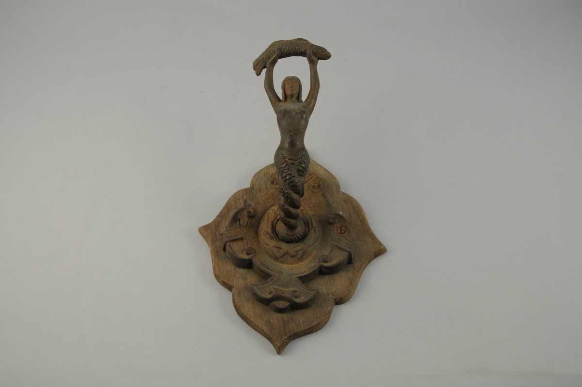PATÈRE en bronze adoptant la forme d'une sirène portant un poisson, sur un cartouche orné de joncs, d'agraphes et de parchemins plissés. Le tout fixé sur un cartouche chantourné en bois naturel. XIXème. Long. 24,3, Larg. 20,4 cm.