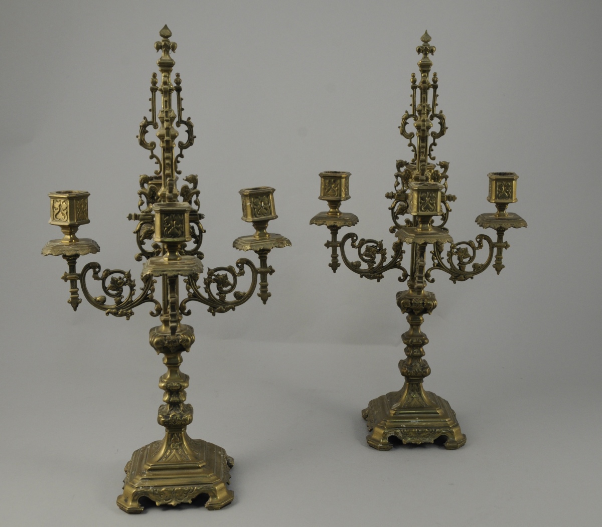 Paire de FLAMBEAUX en bronze, à quatre feux surmontés d'une fleur de lys, les branches retenus par des enroulements à griffons, le fût reposant sur une base rectangulaire feuillagée à quatre petits pieds. Style néo-gothique. Fin XIXème, début XXème. Haut. 46 cm.