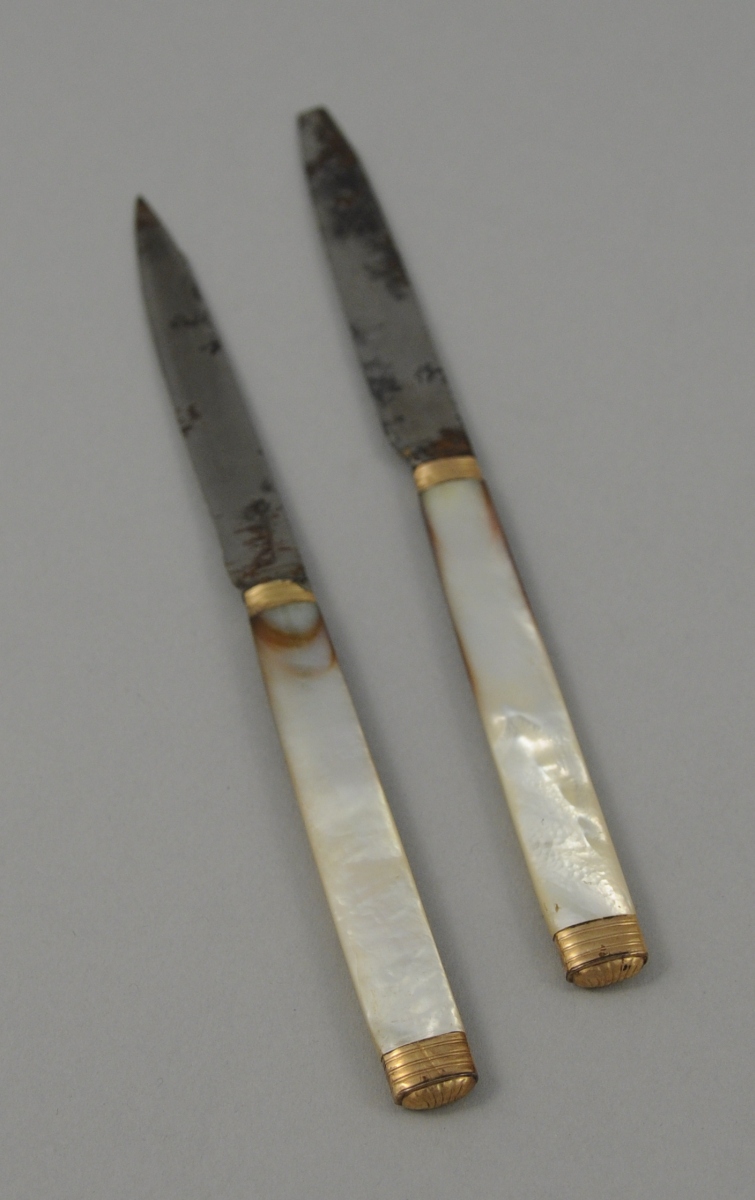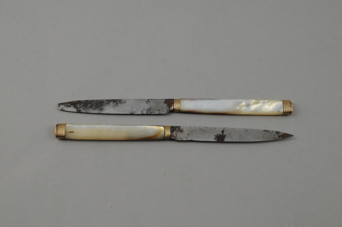 PAIRE de COUTEAUX, le manche en nacre bagué d'or et lame en métal. Long. 18,8 et 19 cm. Fin du XVIIème, début du XIXème. (manques et accidents, lames oxydées).