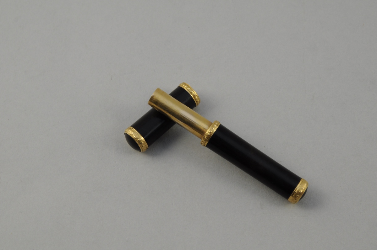 ÉTUI de forme cylindrique en écaille brune. Monture en or jaune. Fin XVIIIème. Long. 9,5 cm.