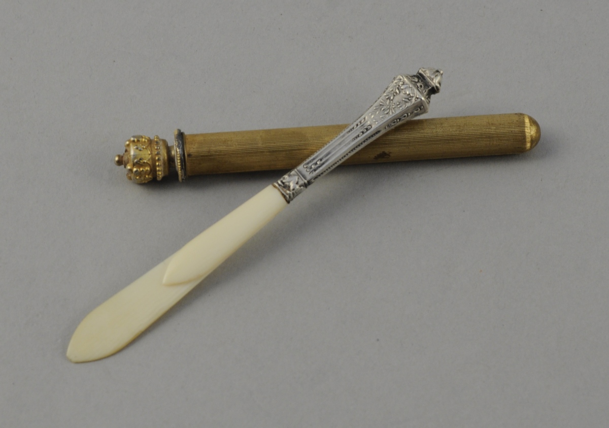 Un COUPE-PAPIER, le manche en métal argenté à décor néoclassique de cannelures à asperges, branches de laurier et bouquets floraux. Double lame en ivoire. Fin XIXème, début XXème. Long. 9,8 cm.