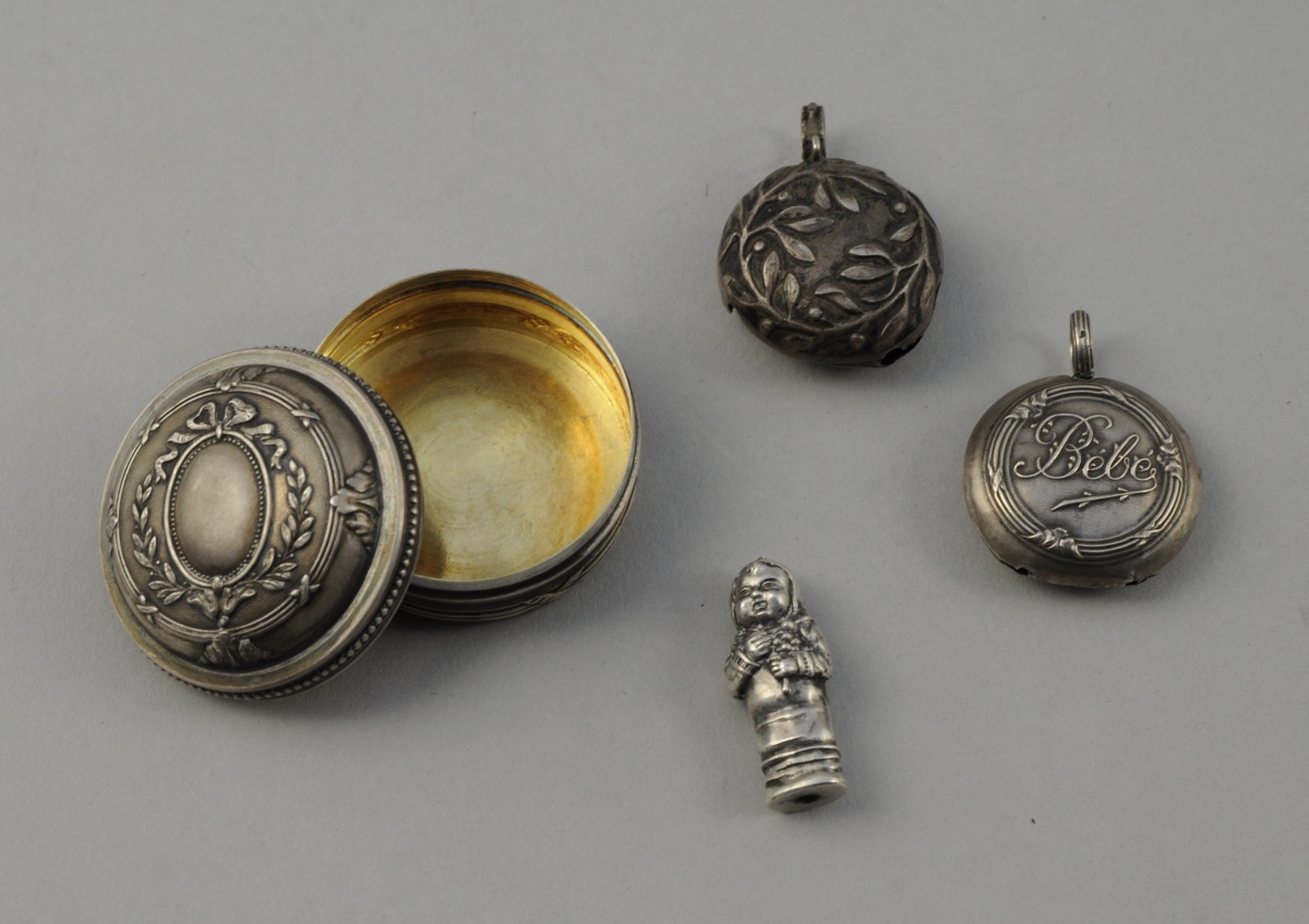 Un HOCHET de forme circulaire portant l'inscription "Bébé" inscrite dans un cercle formé de jonc rubanné et feuilles d'acanthe. Poinçon Sanglier. Début XIXème. Diam. 3 cm. Poids.