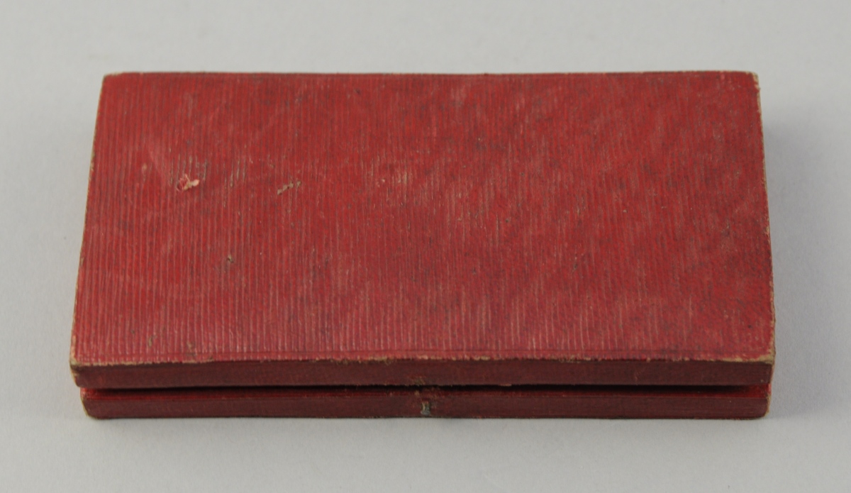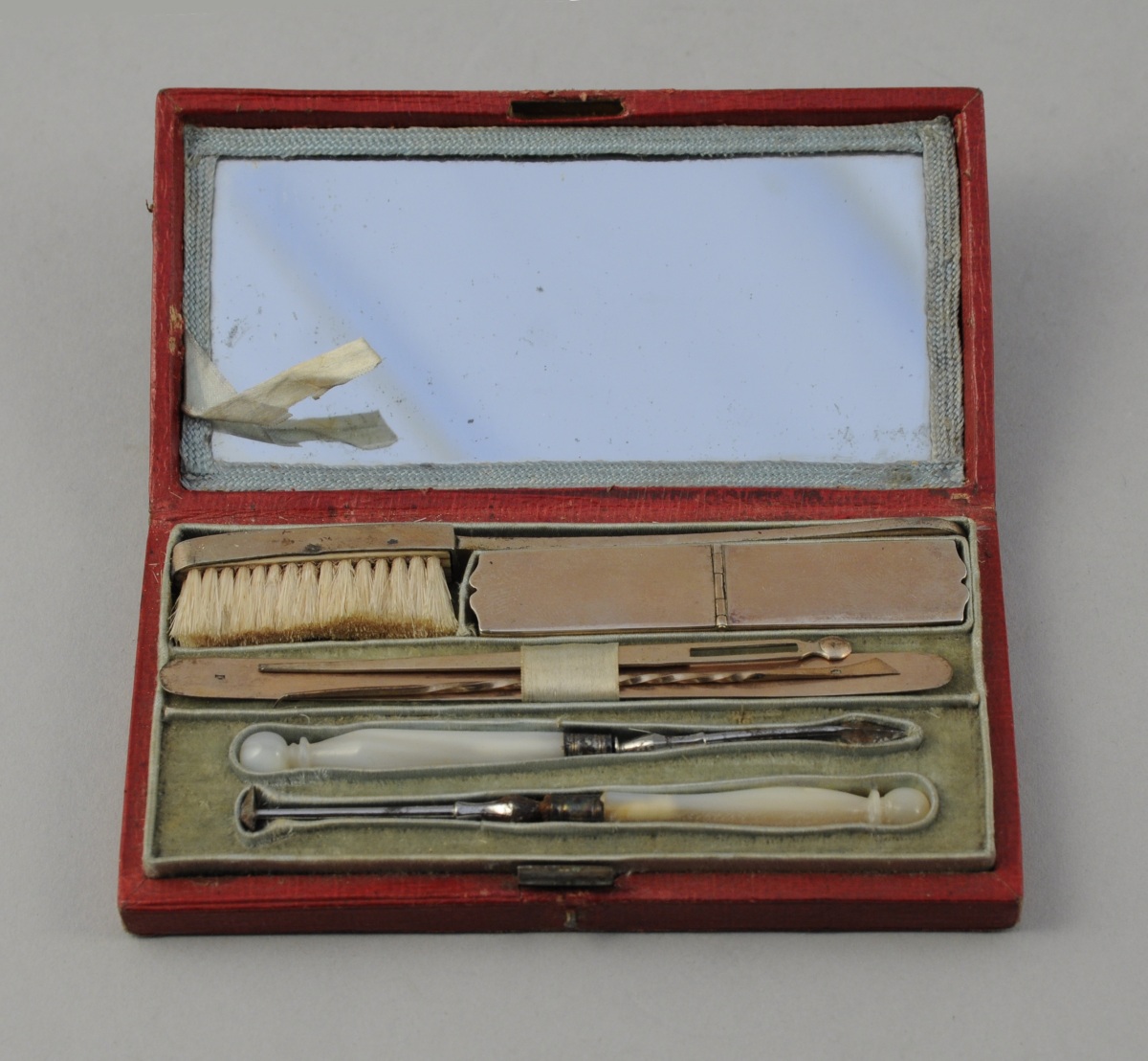NÉCESSAIRE DE TOILETTE en vermeil, argent et nacre comprenant sept pièces. Dans son coffret en maroquin rouge garni de velour vert et foncé d'un miroir. Début XIXème. Long. 12,2, Larg. 6,5 cm. Comporte une ancienne étiquette en partie déchirée imprimée "Palais-Royal".