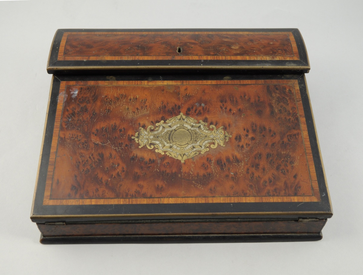 ÉCRITOIRE en placage de ronce de noyer, dans des encadrements d'ébène et de bois de rose. L'abattant est orné d'un médaillon à rinceaux en laiton et nacre, et est foncé intérieurement de cuir vert. Casier supérieur à compartiments.