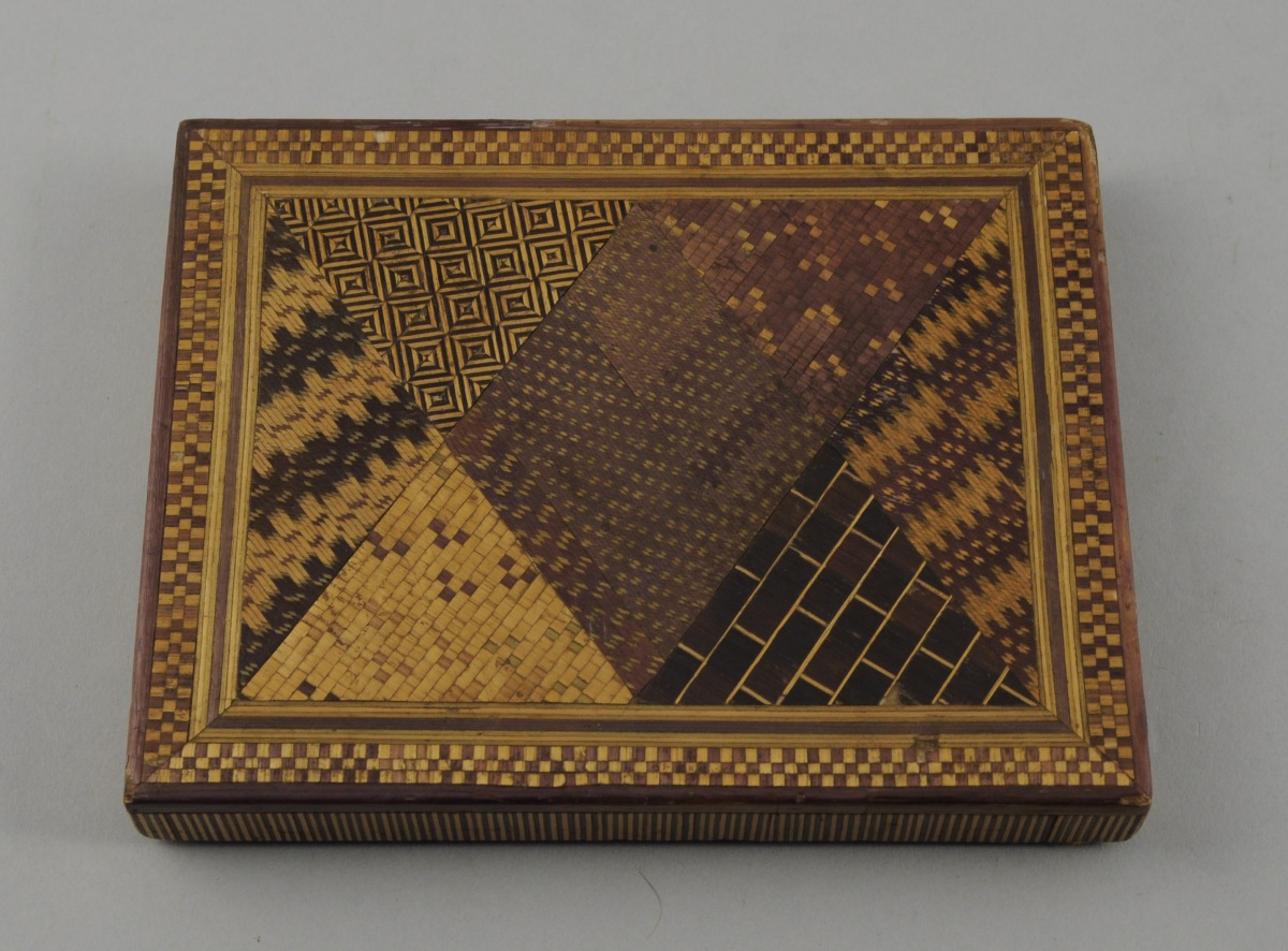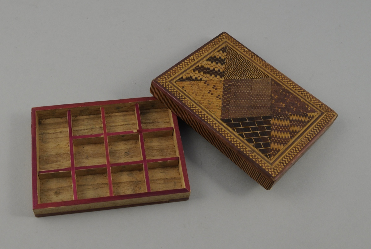 BOITE rectangulaire en marqueterie de paille. Décor losangique reprenant différents types de tissage, filets et damier sur le bord. L'intérieur compartimenté. Début XXème. Long. 14,5, Larg. 11,3, prof. 2,3 cm. (petits manques à la marqueterie)