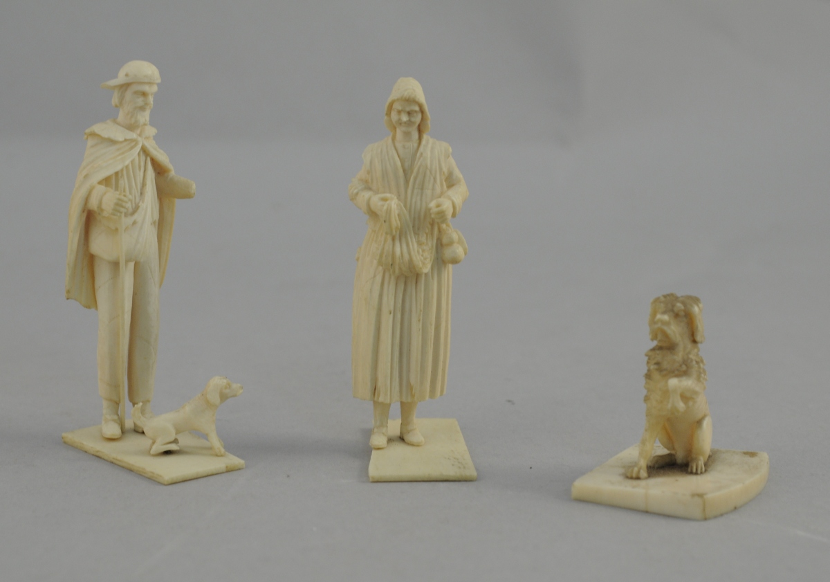 DEUX SANTONS en ivoire sculpté. Un pélerin accompagné de son chien et une paysanne.
