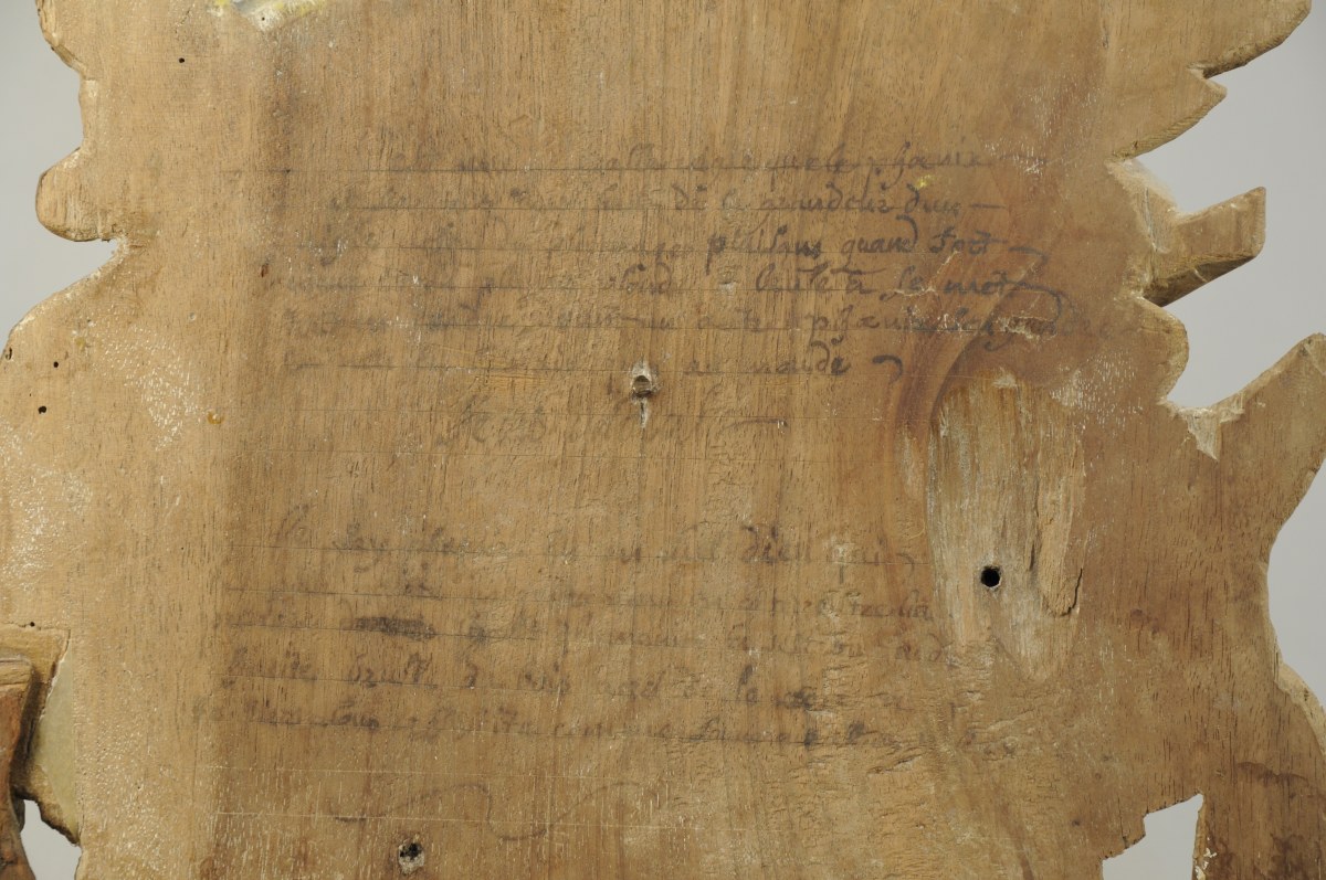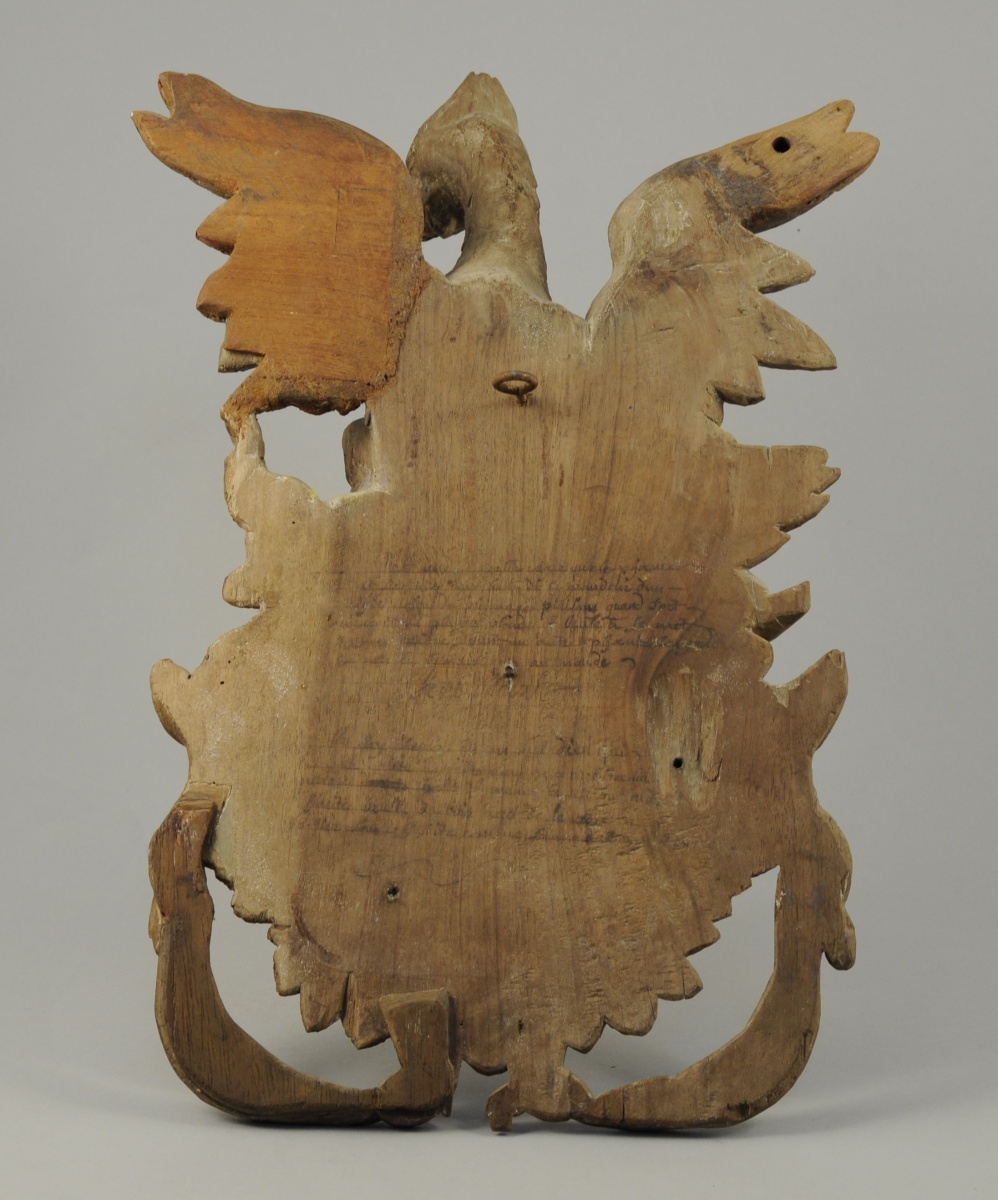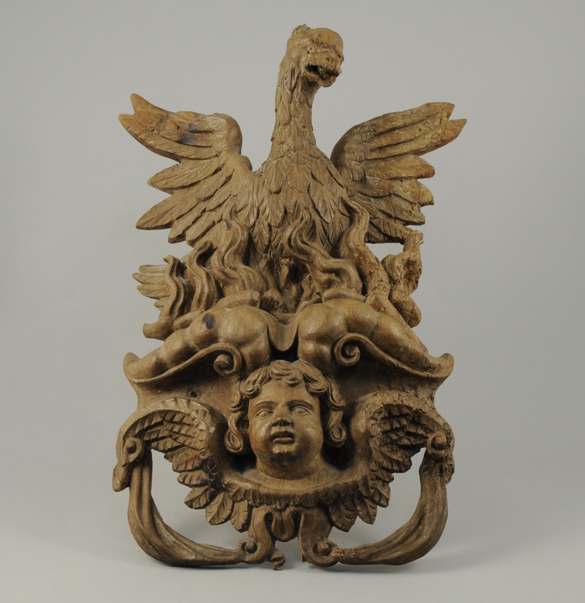 ÉLÉMENT DÉCORATIF en noyer sculpté représentant le Phoenix, ailes déployées, surgissant d'un foyer ardent. Il présente une figure d'amour encadrée de draperies et volutes en partie inférieure. Inscription à l'encre au dos. Travail ancien de style Haute Époque. Haut. 55, Larg. 35,5 cm.