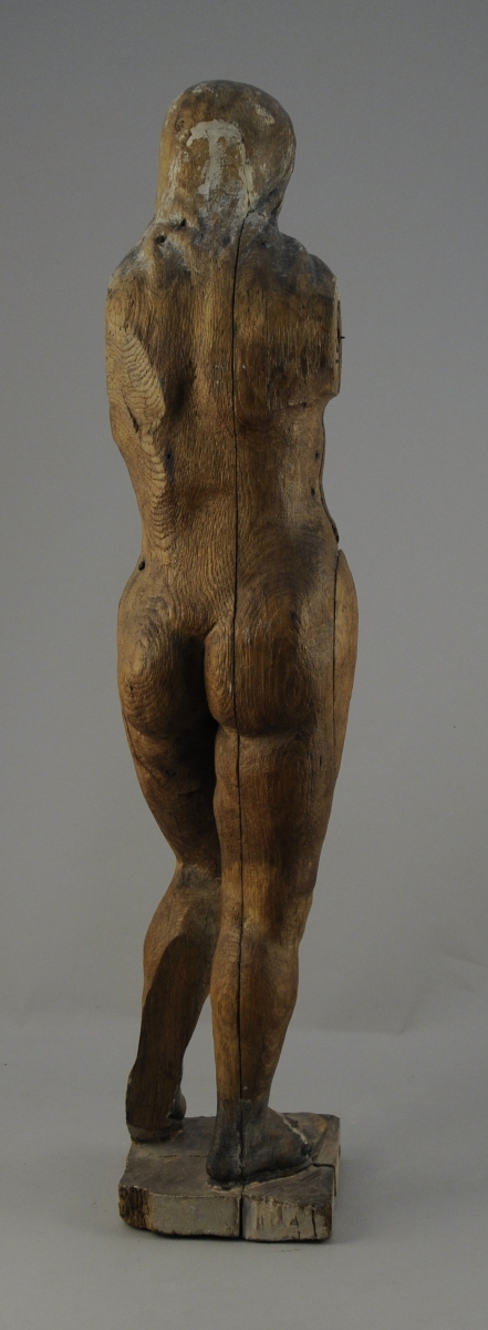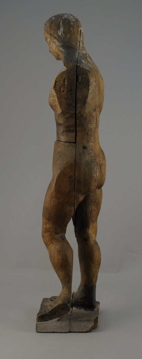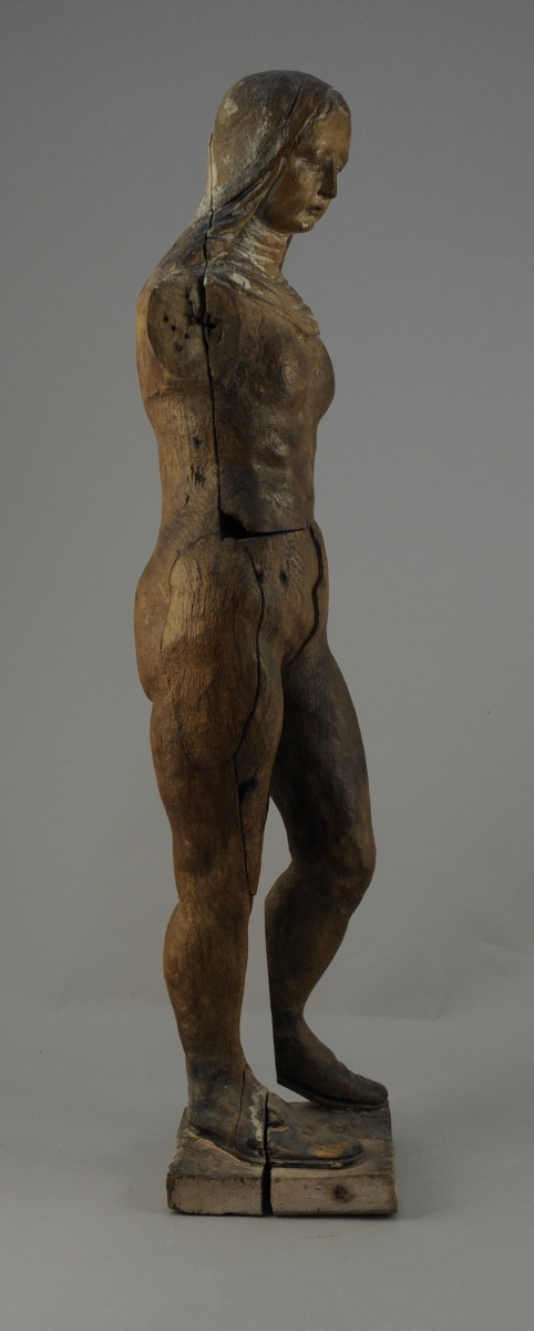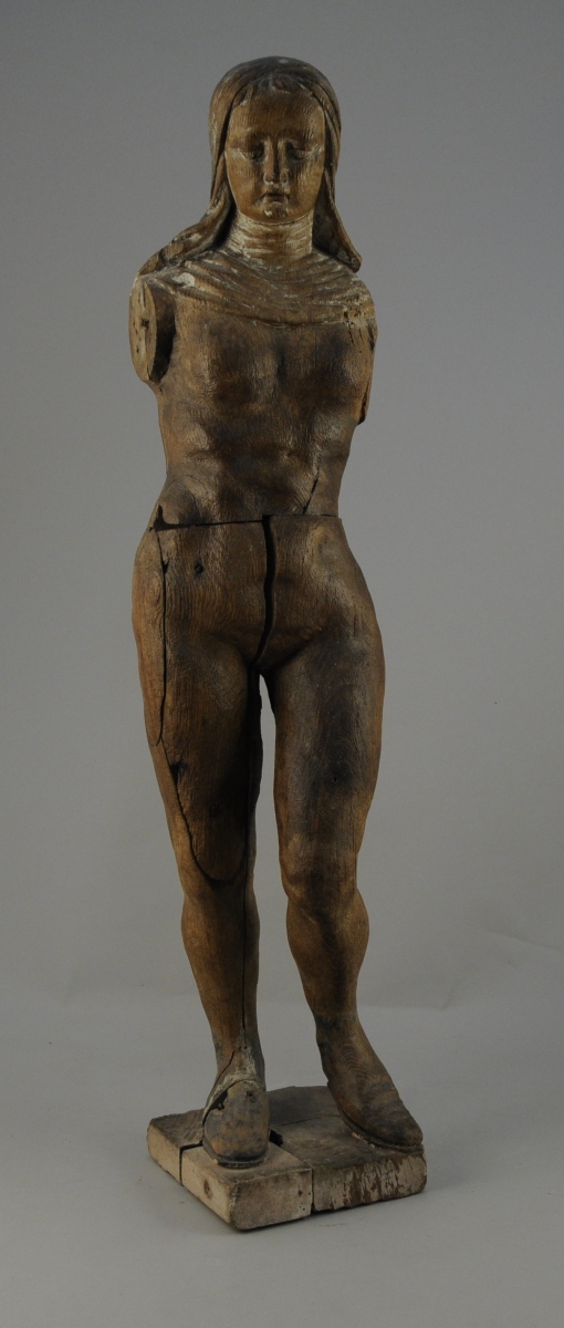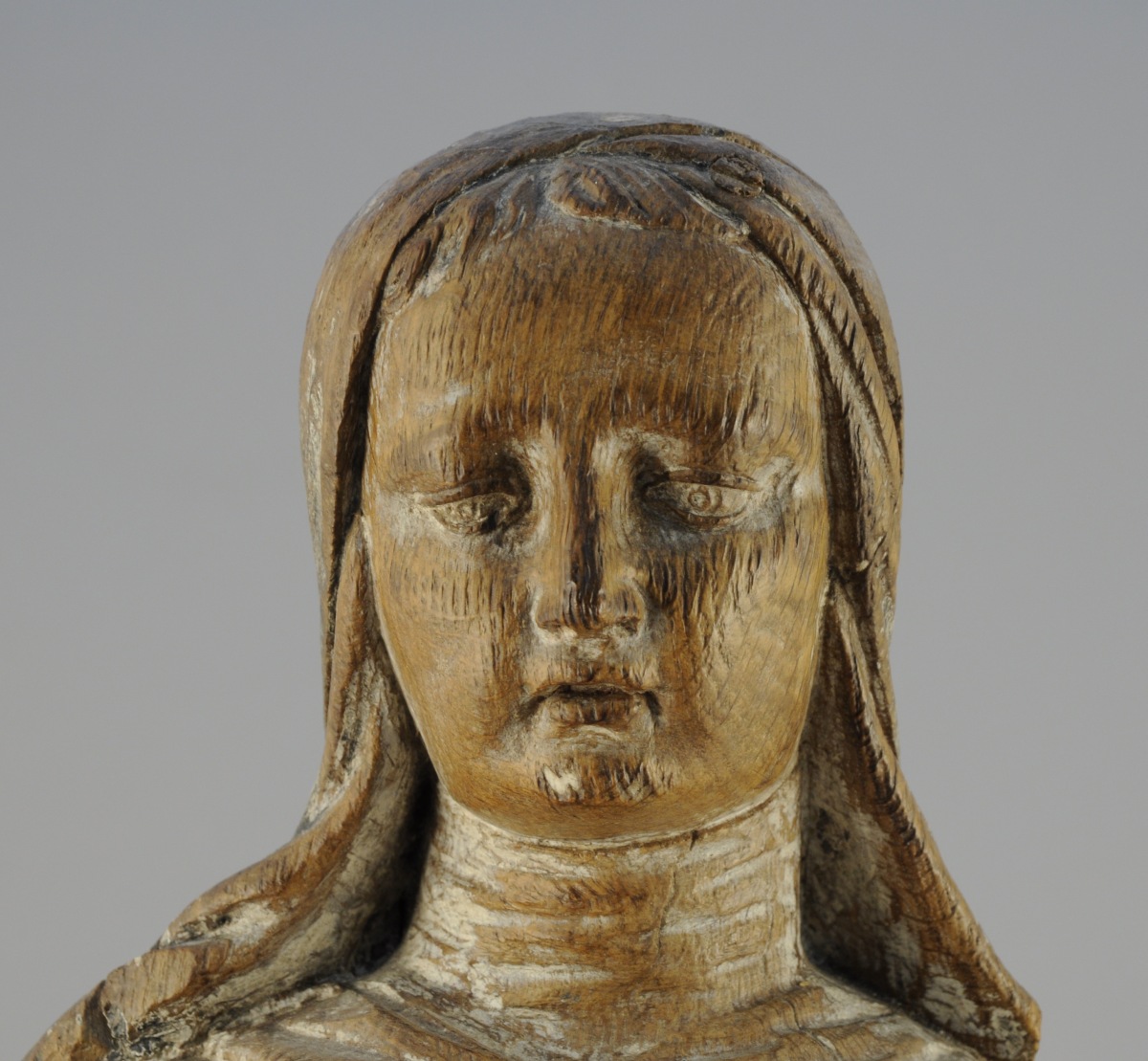STATUE en bois sculpté en ronde-bosse. Probablement une Sainte. Sa tête couverte d'un voile. Elle adopte une position en contrapposto.Travail ancien. Haut. 83 cm.