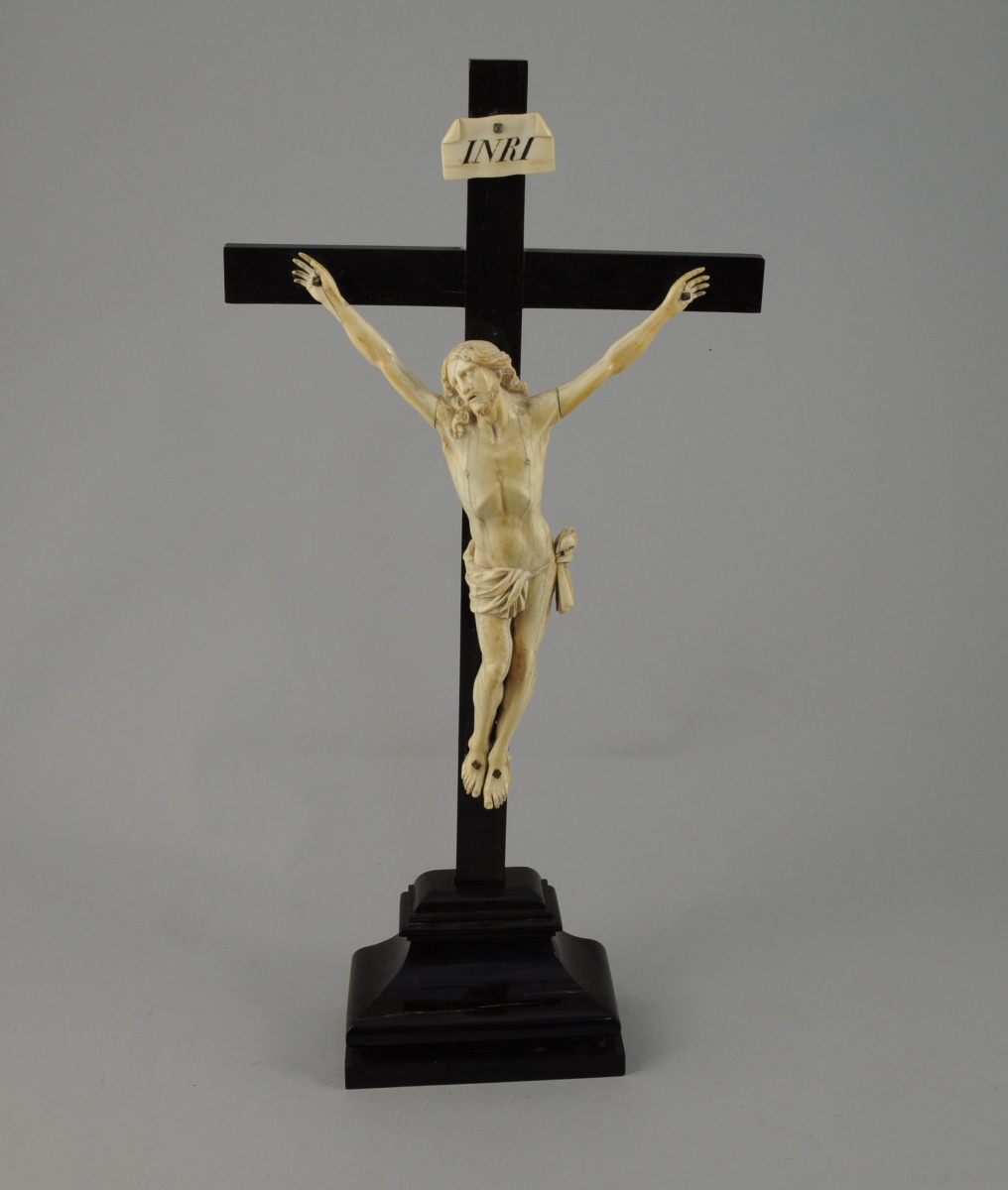 CRUCIFIX en ivoire et ébène. Christ aux bras levé, tête inclinée à gauche, périzonium noué à droite. Avec son phylactère.