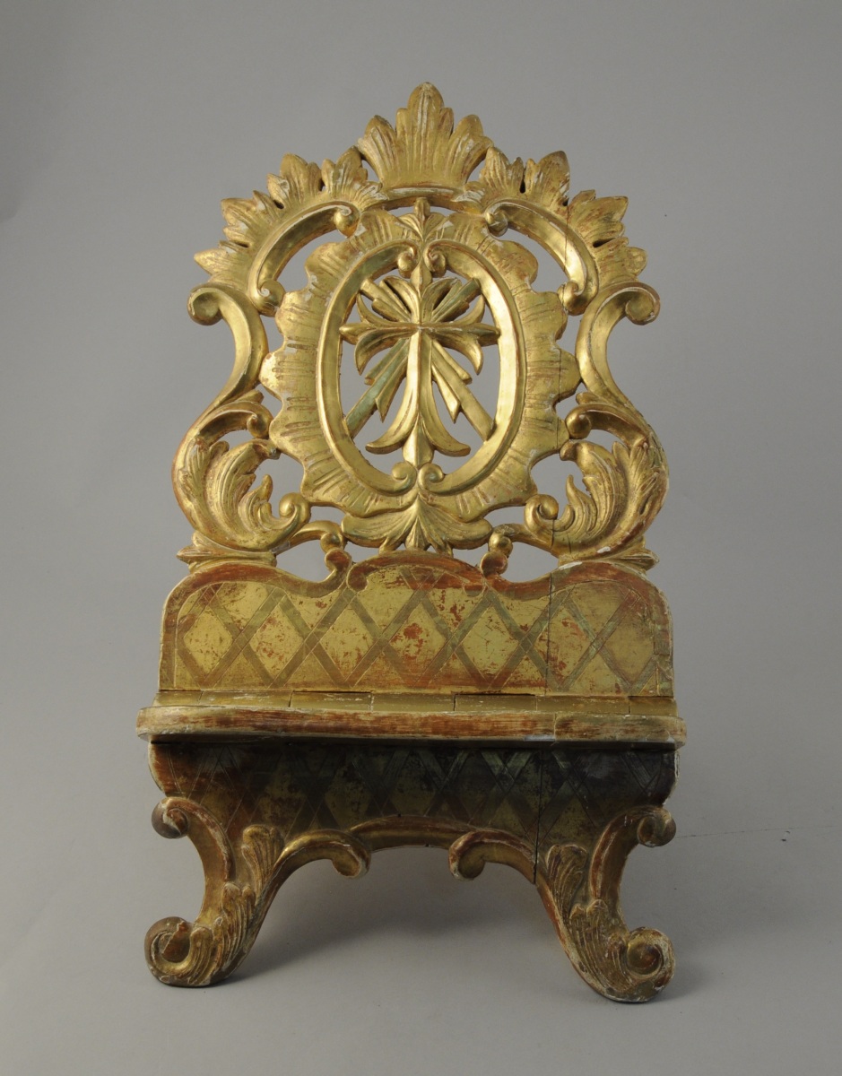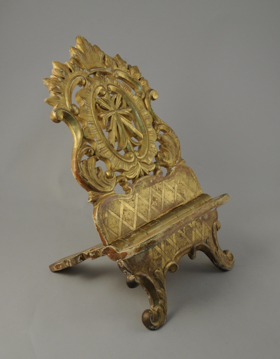 PORTE-LIVRE de forme chantournée en bois sculpté et doré. Riche décor dans le style rocaille d'agrafes, feuilles d'acanthe stylisées et quadrillages centré d'une croix fleuronnée rayonnante. Repose sur quatre pieds, les antérieurs terminés en volute soulignée d'une acanthe. XIXème. Haut. 44, Larg. 29, Prof. 26 cm.