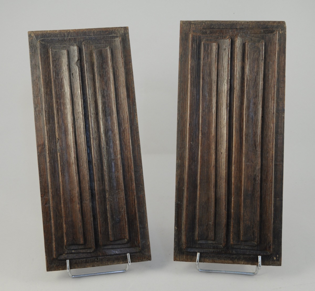 PAIRE DE PANNEAUX en chêne sculpté à décor de plis de parchemin. Début XVIème. Haut. 36,7, Larg. 16,1 cm.