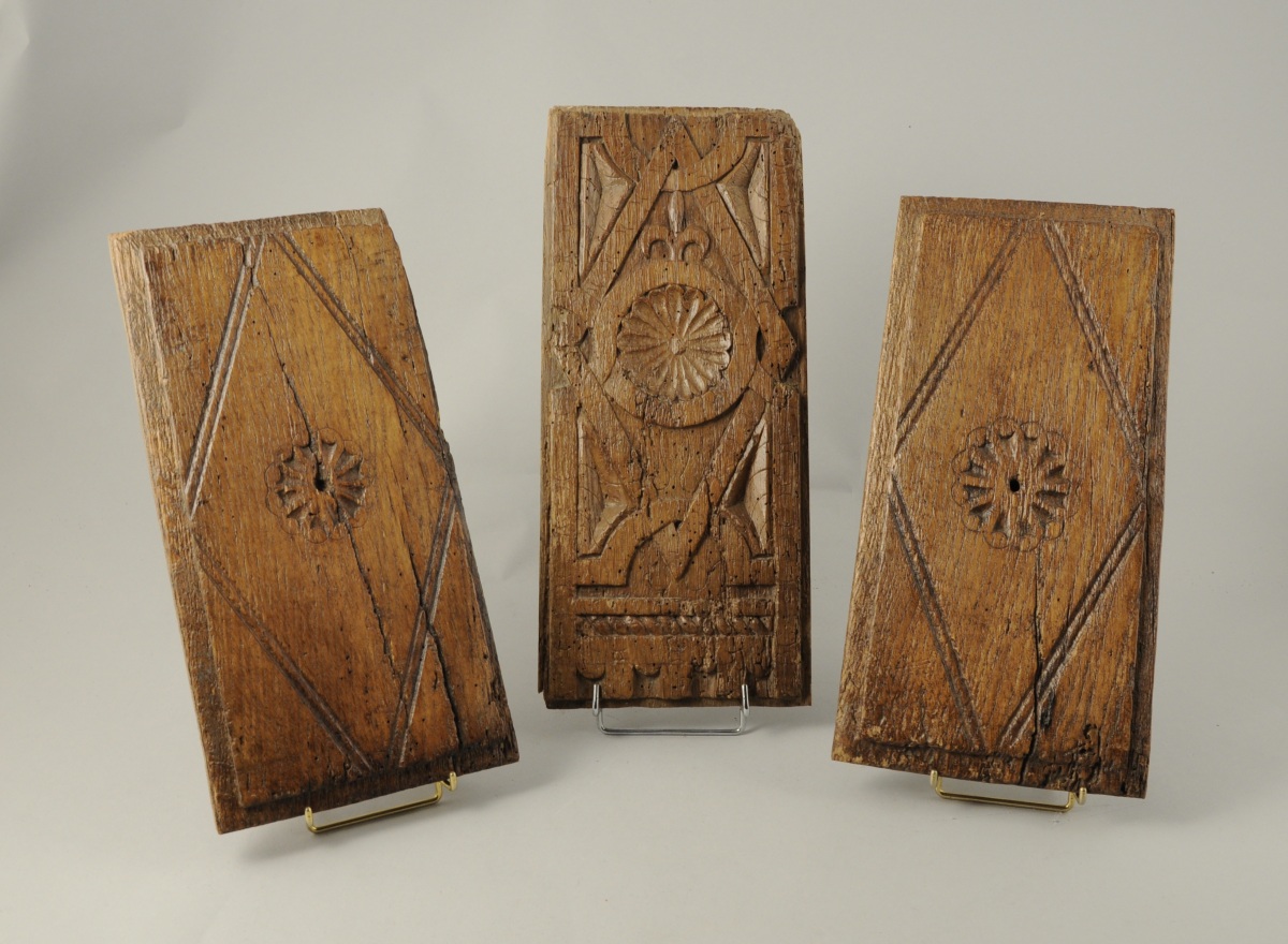 Une paire à décor d'un losange centré d'une rosace, le troisième orné d'une rosace sommée d'un motif fleurdelysé s'inscrivant dans un losange entrecroisé d'arcs de cercle et présentant, en partie inférieure, une cordelette et quatre larges cannelures. XVIème. Haut. 33,9, Larg. 17 et Haut. 38,1, Larg. 16,9 cm.