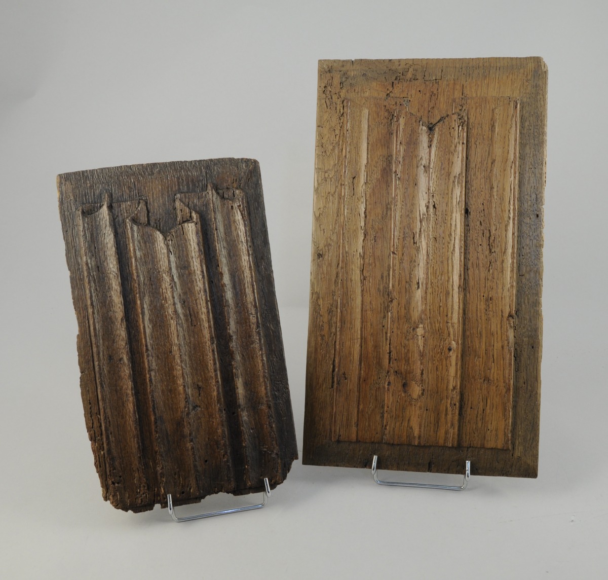 DEUX PANNEAUX en chêne sculpté à décor de plis de parchemins. Début XVIème. Haut. 40,8, Larg. 22,9 et Haut. 32,6, Larg. 19,4 cm.