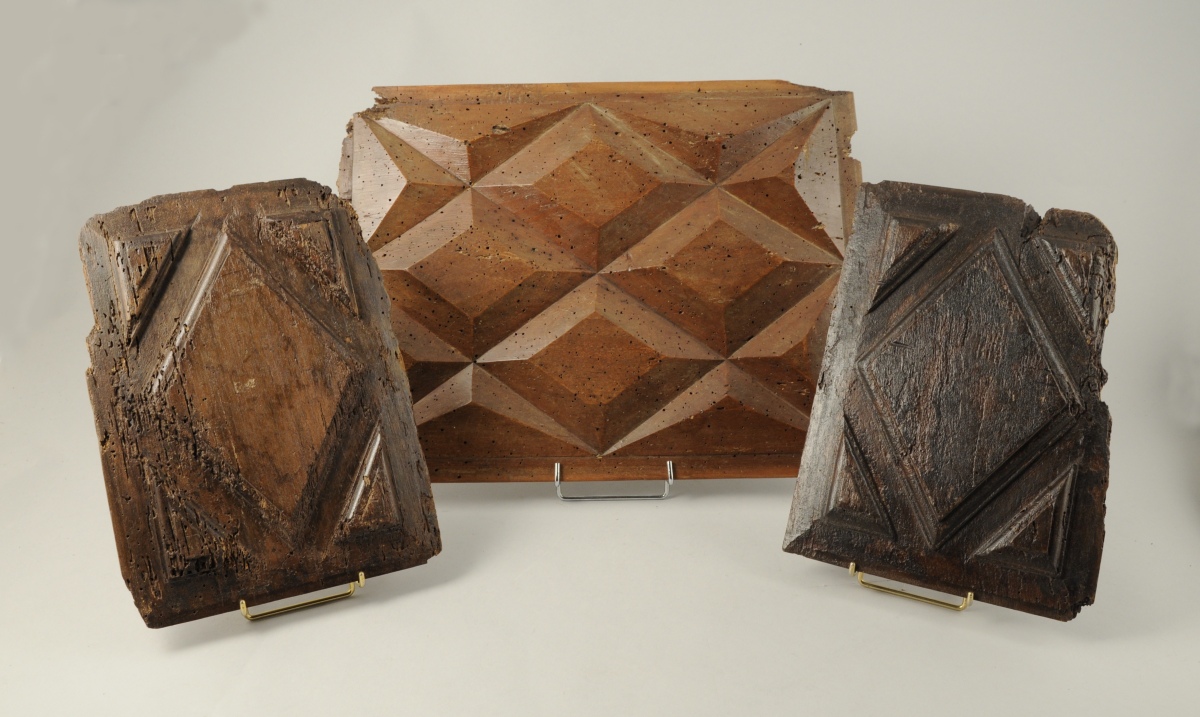 TROIS PANNEAUX dont une paire en bois sculpté à décor losangé. Début XVIIème. Haut. 45,9, Larg. 34,6 et Haut. 29,3, Larg. 21,3 cm.