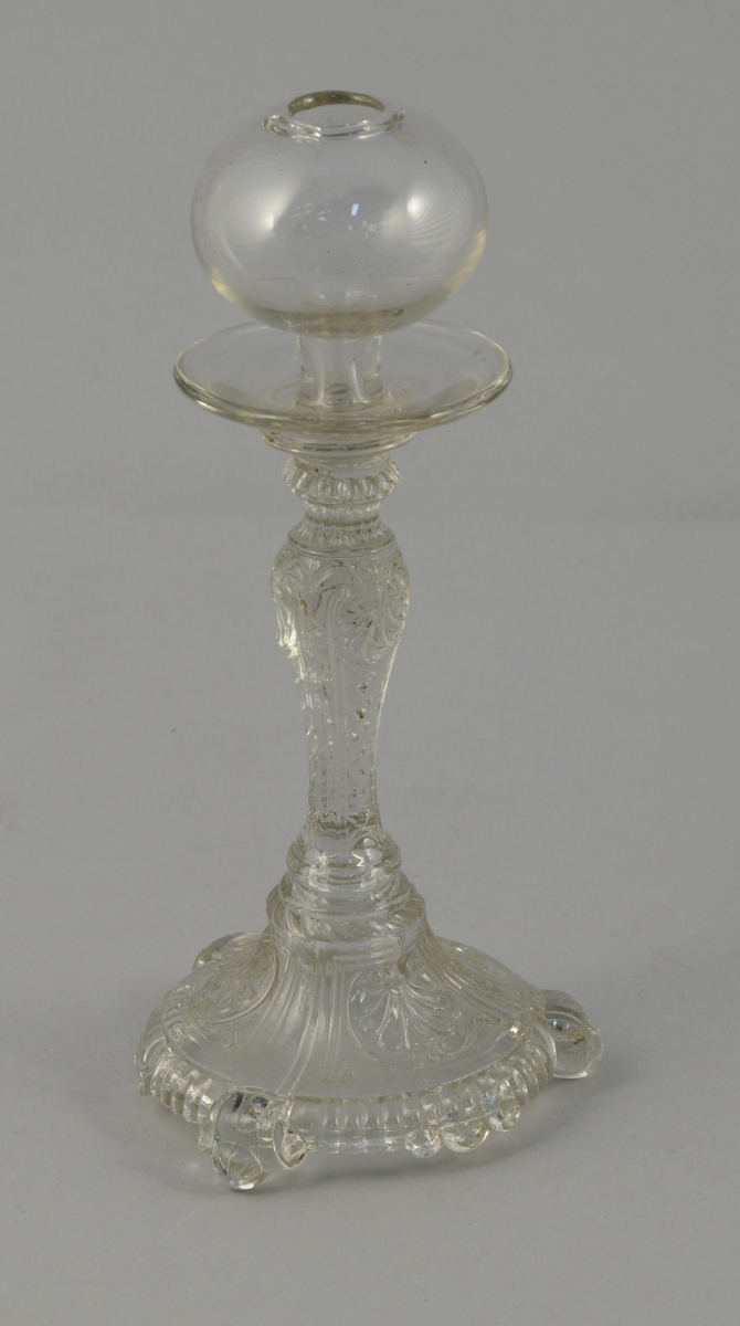 LAMPE À HUILE en verre pressé-moulé et soufflé pour la partie supérieure. Piétement tripode et fût ornés de coquilles.