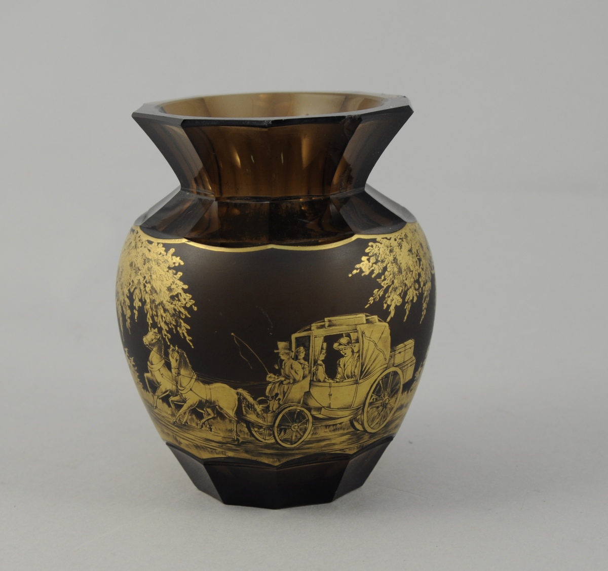 VASE en verre foncé. Décor doré sur la panse, figurant une calèche dans un paysage. XXème. Haut. 13 cm. (deux ébréchures)