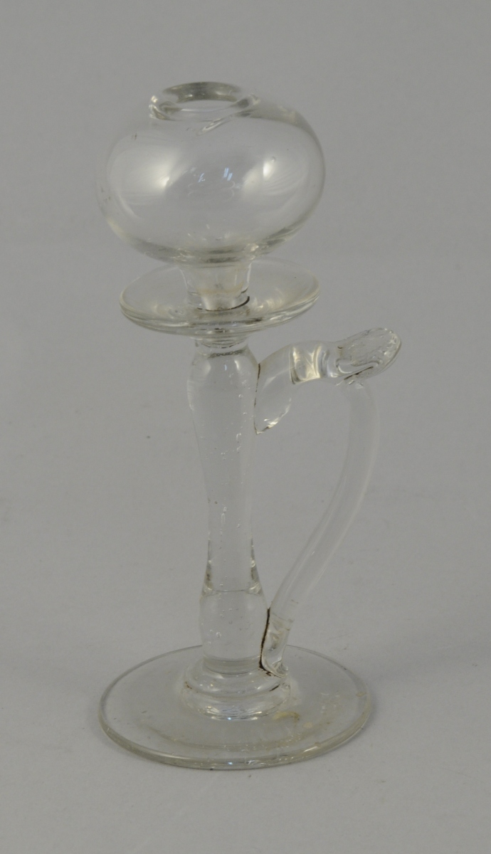 LAMPE À HUILE en verre soufflé, avec anse et bouton de préhension.
