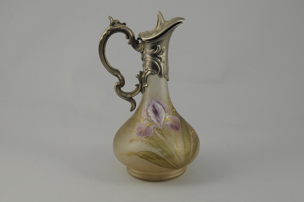 AIGUIÈRE en verre à décor émaillé d'un lys violet. Monture en métal argenté, à décor d'agrafes, feuillages et fleurs d'esprit rocaille.