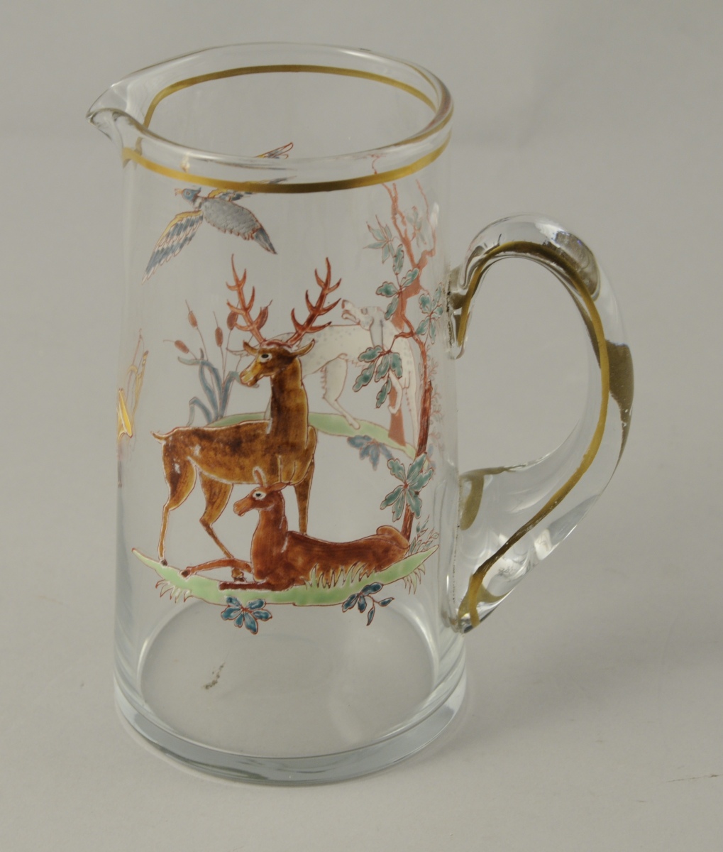 - Pichet tronconique en verre soufflé et anse appliquée. Décor polychrome peint d'un cerf et d'une biche sur un tertre d'un côté, d'un chien de chasse tacheté sur un tertre de l'autre, d'un cor de chasse et d'un colvert en vol. Filet or sur le col. XXème. Haut. 19,5 cm.