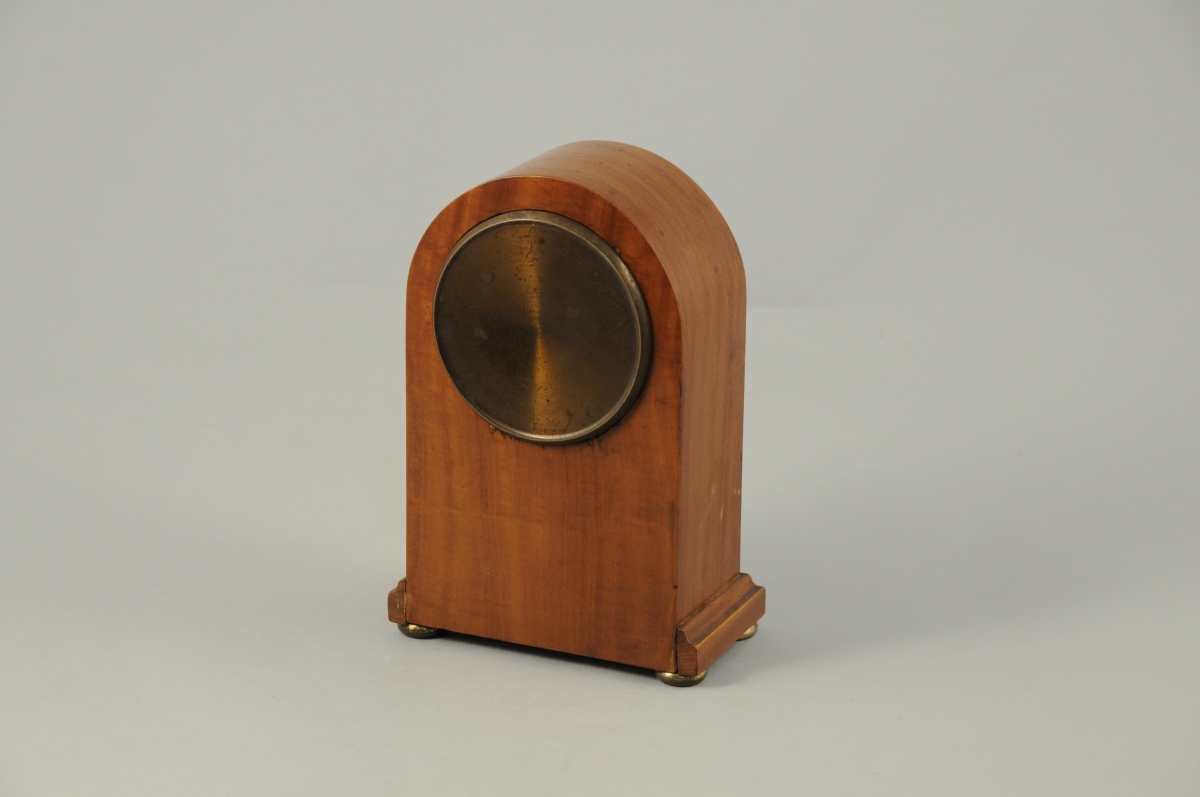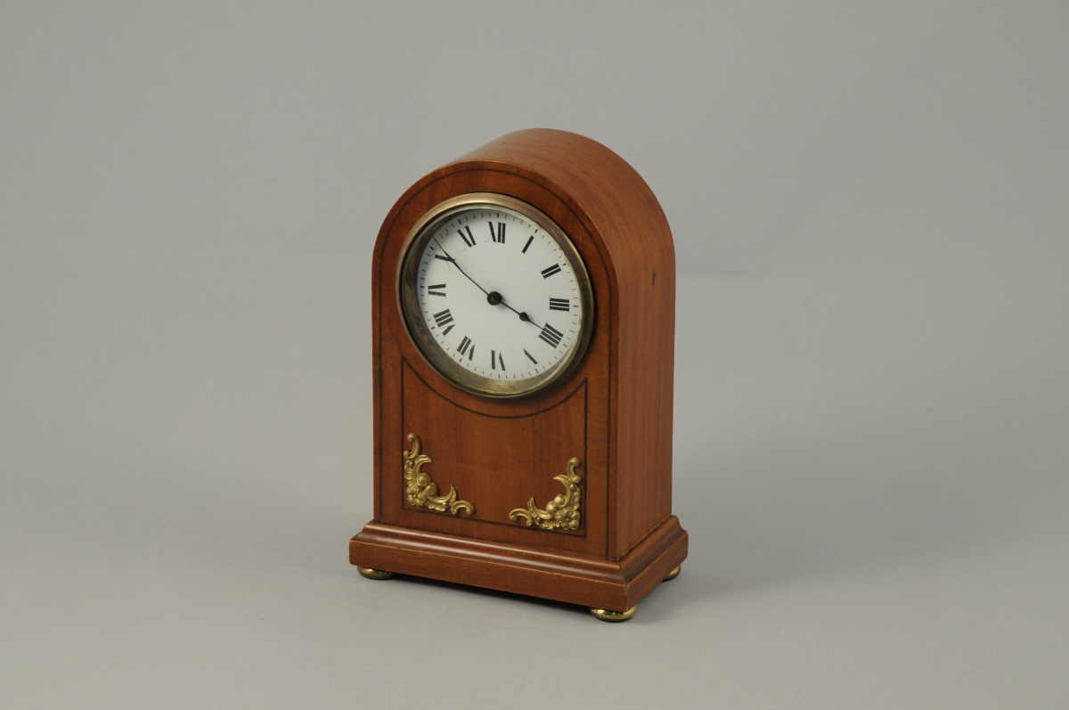 PENDULE BORNE en bois vernis à inscrustations de filets de bois sombre garnie de deux agrafes en métal repoussé. Elle repose sur quatre pieds en bronze. XXème. Haut. 21, Larg. 14, Prof. 8 cm.