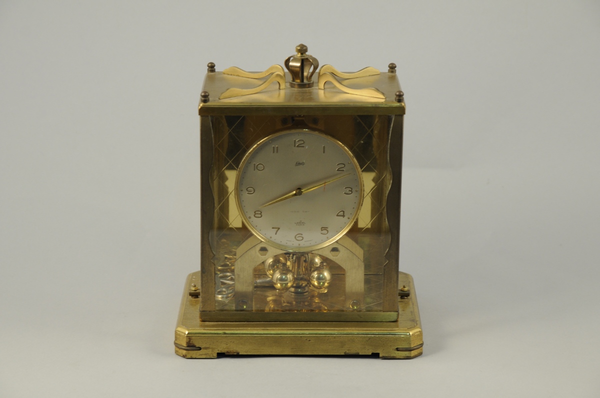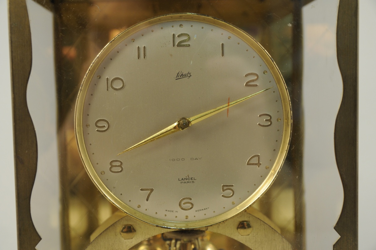 LANCEL. Pendule squelette 1000 jours dans sa cage rectangulaire en laiton. Mouvement signé de Schatz. Haut. 24, Larg. 20, Prof. 15 cm.