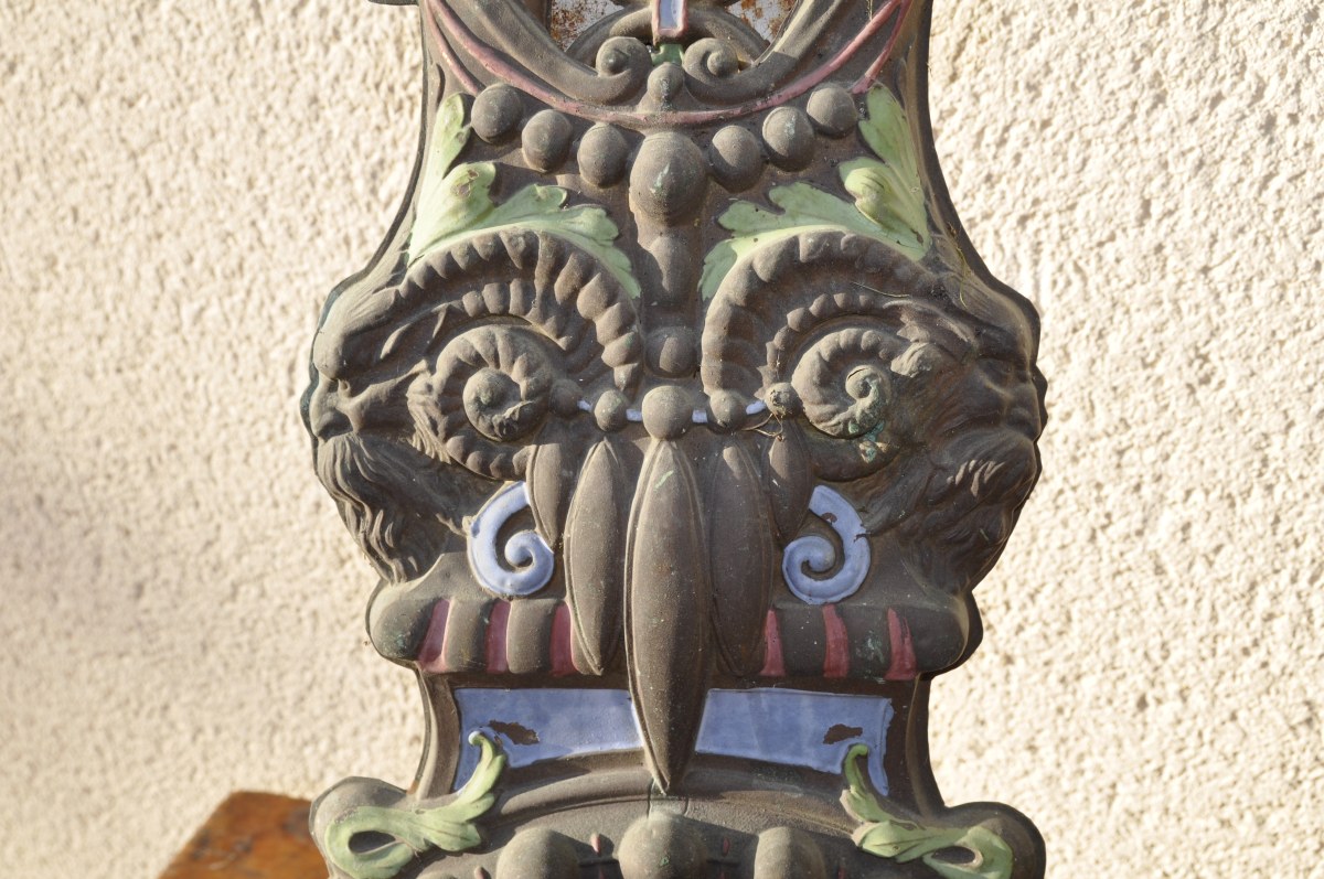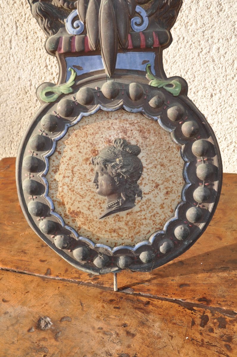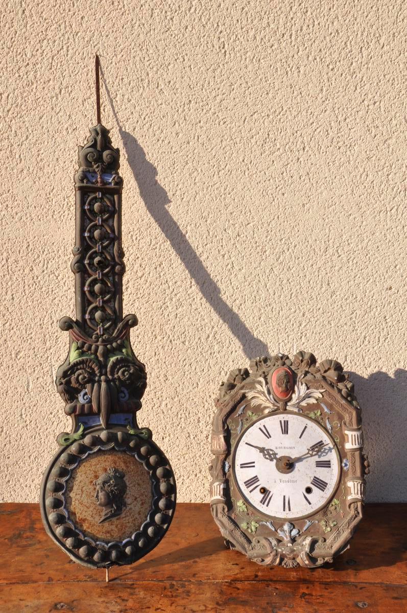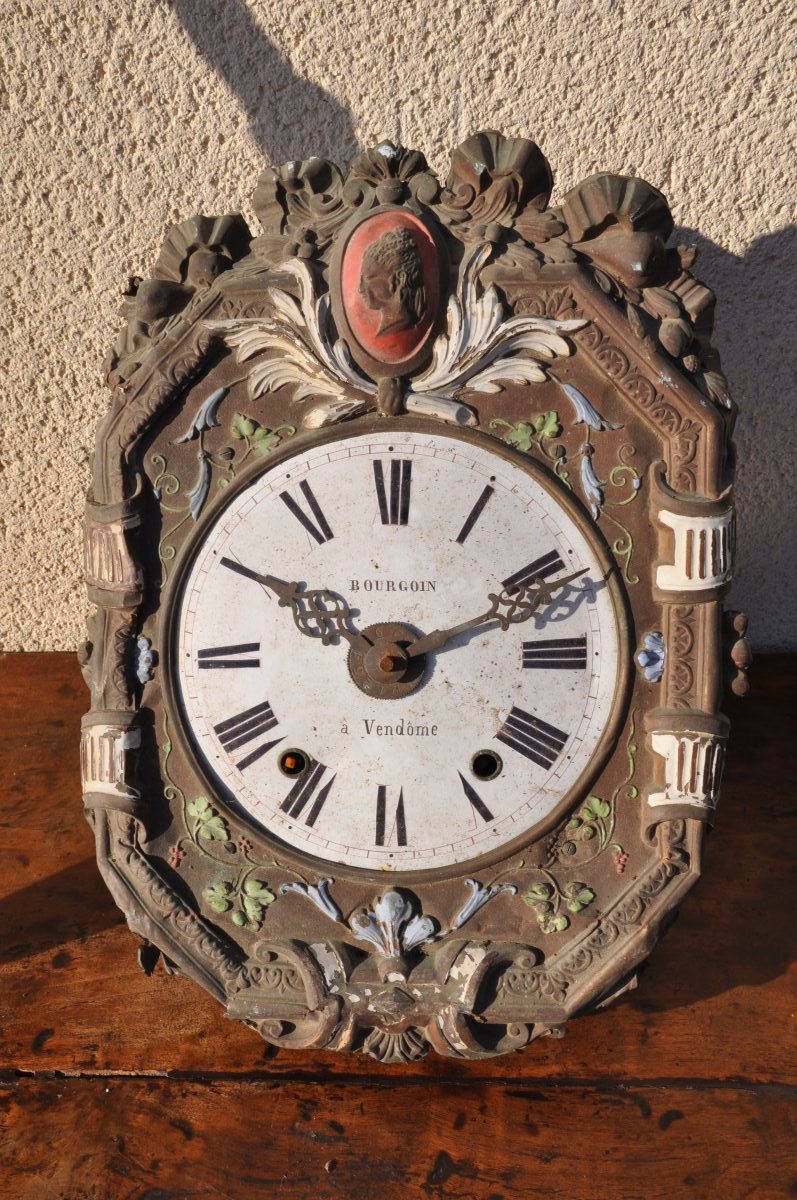 Mouvement d' HORLOGE COMTOISE et son balancier. Cadran en émail signé "BOURGOIN / à Vendôme", entourage en laiton à décor repoussé et peint dans le goût de la Renaissance, volutes feuillagées, médaillons centrés d'un profil de femme, profil de faunes. Début XXème. Mouvement, Haut. 44, Larg. 33, Prof. 16 cm. Balancier, Haut. 106, Larg. 28,5 cm. (dans l'état)