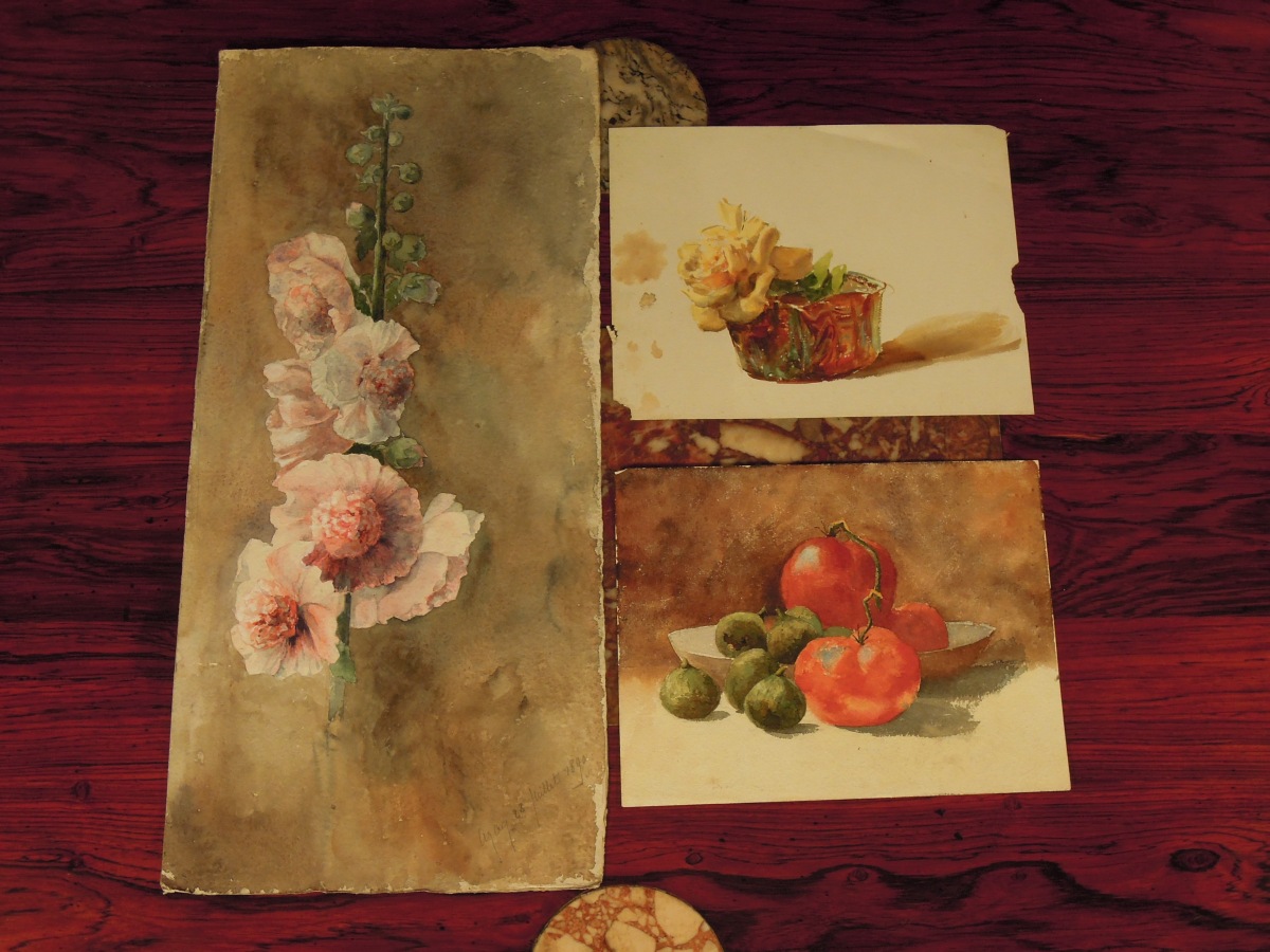 Marguerite de BIENCOURT. Roses trémières, roses et nature morte.