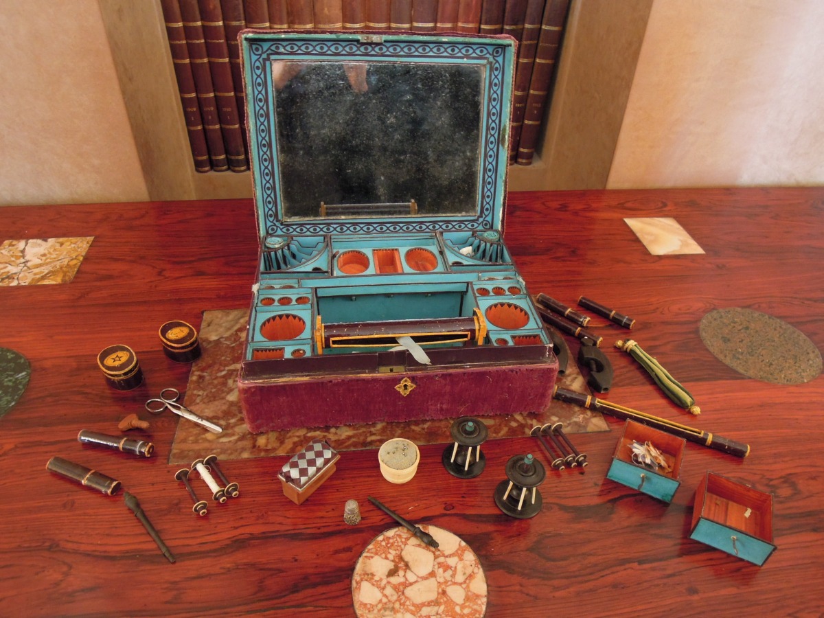 Provenance: Trois billets manuscrits précisent l'origine de ce coffret: " boite à ouvrage faite par mon père pendant sa prison au Temple 1805 et 1806 laissé par ma mère à Louis-Henriette me l'a envoyé en 8re 1868 laissé par moi 1869 ". sur le deuxième une précision est apportée: " le dé est celui dont ma mère s'est servie pendant l'émigration. Les ciseaux ont été envoyés d'Angleterre à ma tante XXX pendant son séjour en Pologne 1794 ".