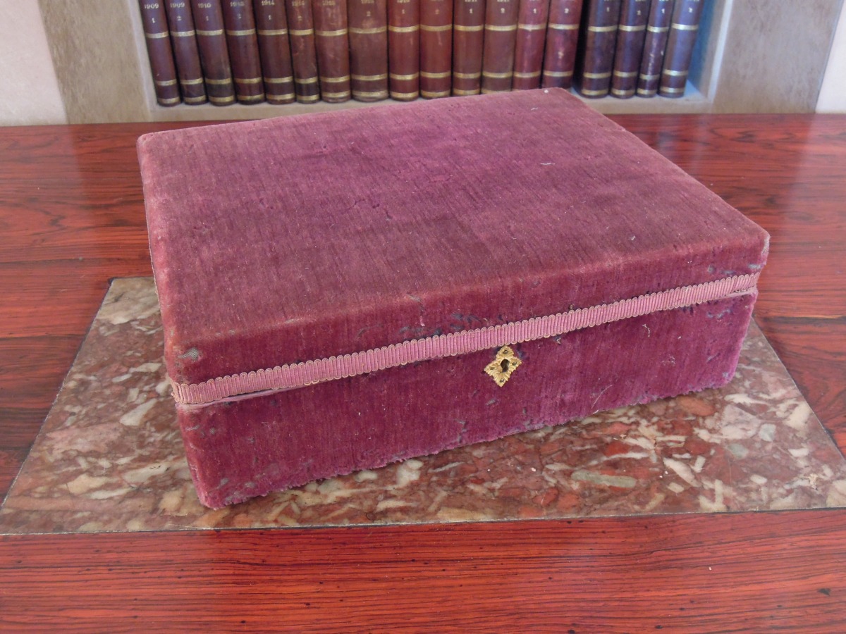 BOITE À OUVRAGE RELIQUAIRE DE L'ÉMIGRATION en carton, l'extérieur recouvert d'un velours cramoisi, l'intérieur foncé d'un papier bleu turquoise à frise de grecque. L'abatant est foncé d'un miroir. De nombreuses petites boites, rangements et compartiments astucieux découvrent une multitude d'accessoires à couture notamment. Deux boites parlantes à l'ancre de marine et à l'étoile: " Je n'espère " " qu'en elle ".