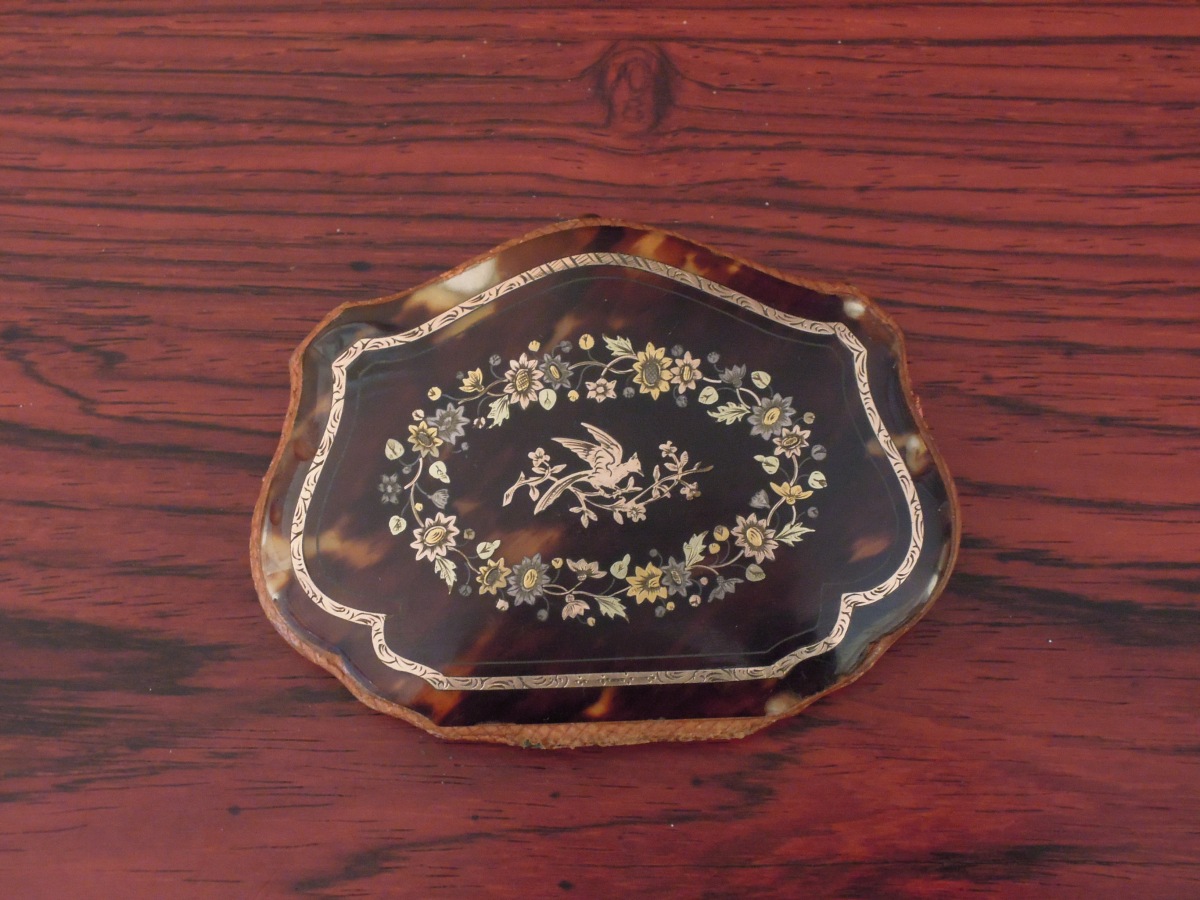 PORTE-BILLETS en écaille marqueté en or (?) jaune, blanc et rose de fleurs et oiseau. L'intérieur ouvrant à trois soufflets de soie rose. Larg. 7,5 cm (accidents, manques).