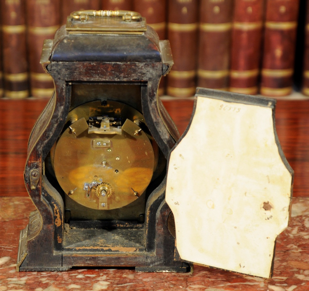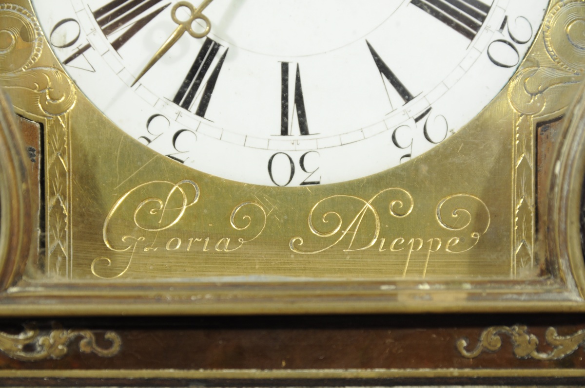 PENDULE DE TABLE A TÊTE DE POUPÉE en écaille et marqueterie de laiton. Le cadran émaillé de chiffres romains pour les heures et arabes pour les minutes dans un panneau de laiton gravé de feuillages et marqué " Gloria A Dieppe ". La porte intérieure recouverte d'une étiquette 26583. Poignée de laiton. Jacques Gloria (Dieppe, vers 1640 - Rouen, 1705) est connu comme horloger à Dieppe en 1696. Louis XIV. Travail de style, mouvement non d'origine.