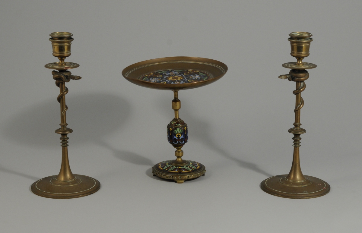 Fin XIXème. Haut. de la coupe: 18 cm. Haut. des flambeaux: 26 cm. (quelques petits manques d'émail)